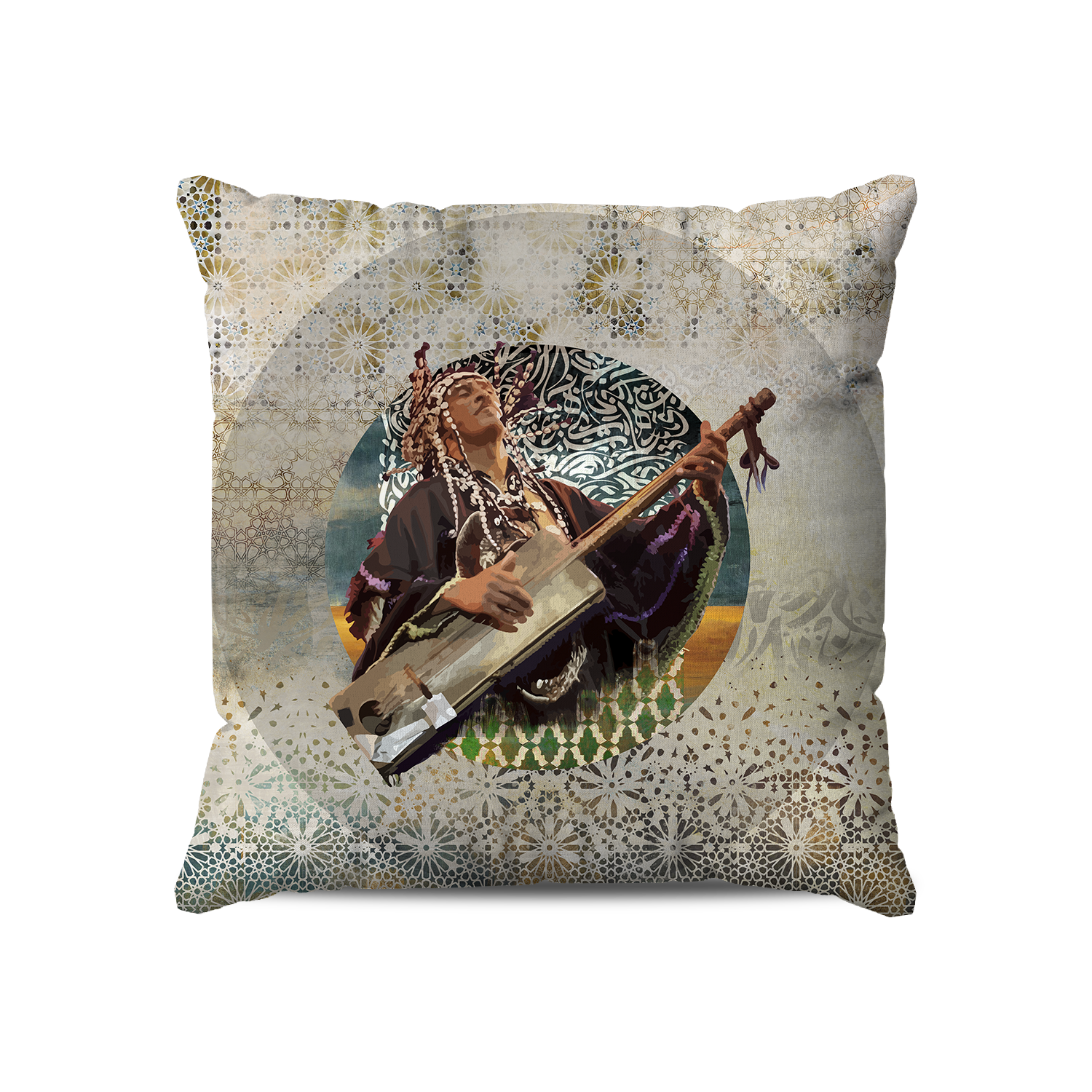 Apportez à votre intérieur harmonie, culture et élégance avec le coussin carré “Le Gnaoui”. Son motif met en lumière un musicien gnaoui, figure emblématique de sagesse et de transmission, entouré de zelliges et mosaïques raffinées dans des nuances de gris et vert. Chaque détail célèbre l’équilibre entre tradition et modernité, faisant de ce coussin un accessoire à la fois esthétique et chargé de sens.