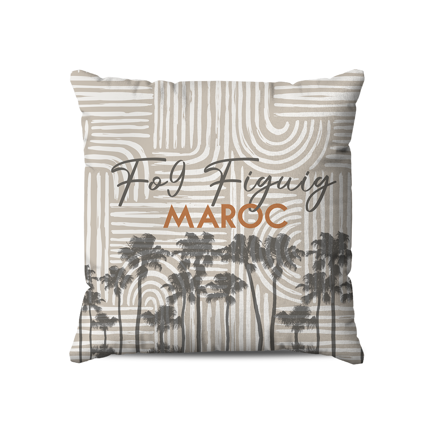 Apportez une touche contemporaine et espiègle à votre intérieur avec le coussin carré “Courbes Subtiles – Fo9 Figuig”. Son motif de traits arrondis, inspiré des portes traditionnelles marocaines, se déploie en tons beige doux sur fond clair, créant une atmosphère apaisante et raffinée. En partie basse, de subtils palmiers gris foncé apportent une note naturelle et graphique, tandis que l’inscription Fo9 Figuig en gris aérien et Maroc en orange lumineux rend hommage à la ville de Figuig avec humour et modernité.