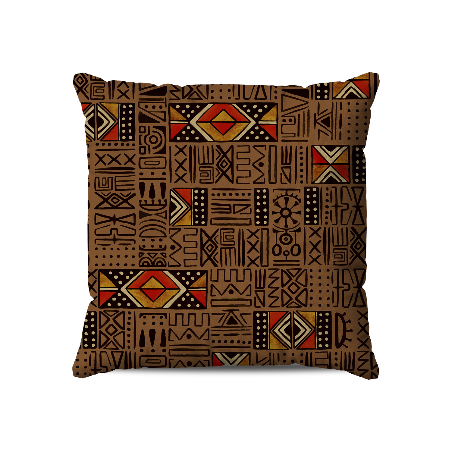 Le coussin “Mélange Tribal – Brun & Rouge” de la collection African Ethnic déploie sur un fond brun chaud et profond une composition foisonnante de symboles tribaux africains. Losanges, croix, étoiles et motifs géométriques s’enchaînent en un pattern dense et rythmé, ponctué d’éclats de rouge, de noir et de blanc qui apportent vivacité et caractère à l’ensemble. Une pièce riche et expressive, qui célèbre la densité et la vitalité des traditions textiles du continent.
