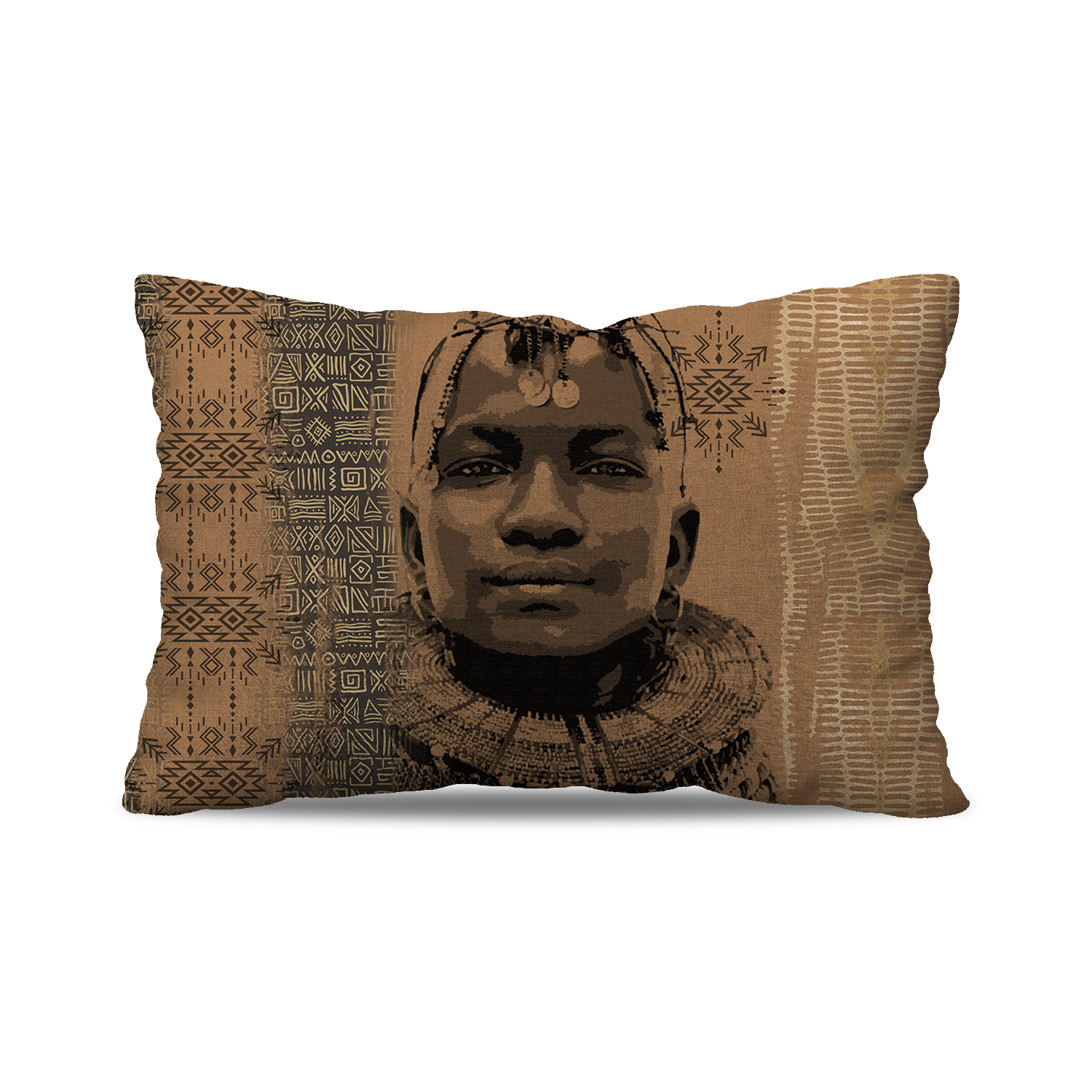 Le coussin “Noble Guerrier – Sépia” de la collection African Ethnic déploie des nuances chaudes et profondes de sépia et de terre brûlée. Le portrait saisissant d’un guerrier paré de ses bijoux traditionnels et de sa coiffe tressée se détache sur un fond composé de deux univers distincts : à gauche, un patchwork de motifs bogolan et symboles ethniques foisonnants, à droite, des lignes tribales épurées en filigrane. Ce contraste subtil entre densité et légèreté crée une composition d’une force tranquille et d’une distinction rare, véritable hommage à la noblesse des cultures africaines.