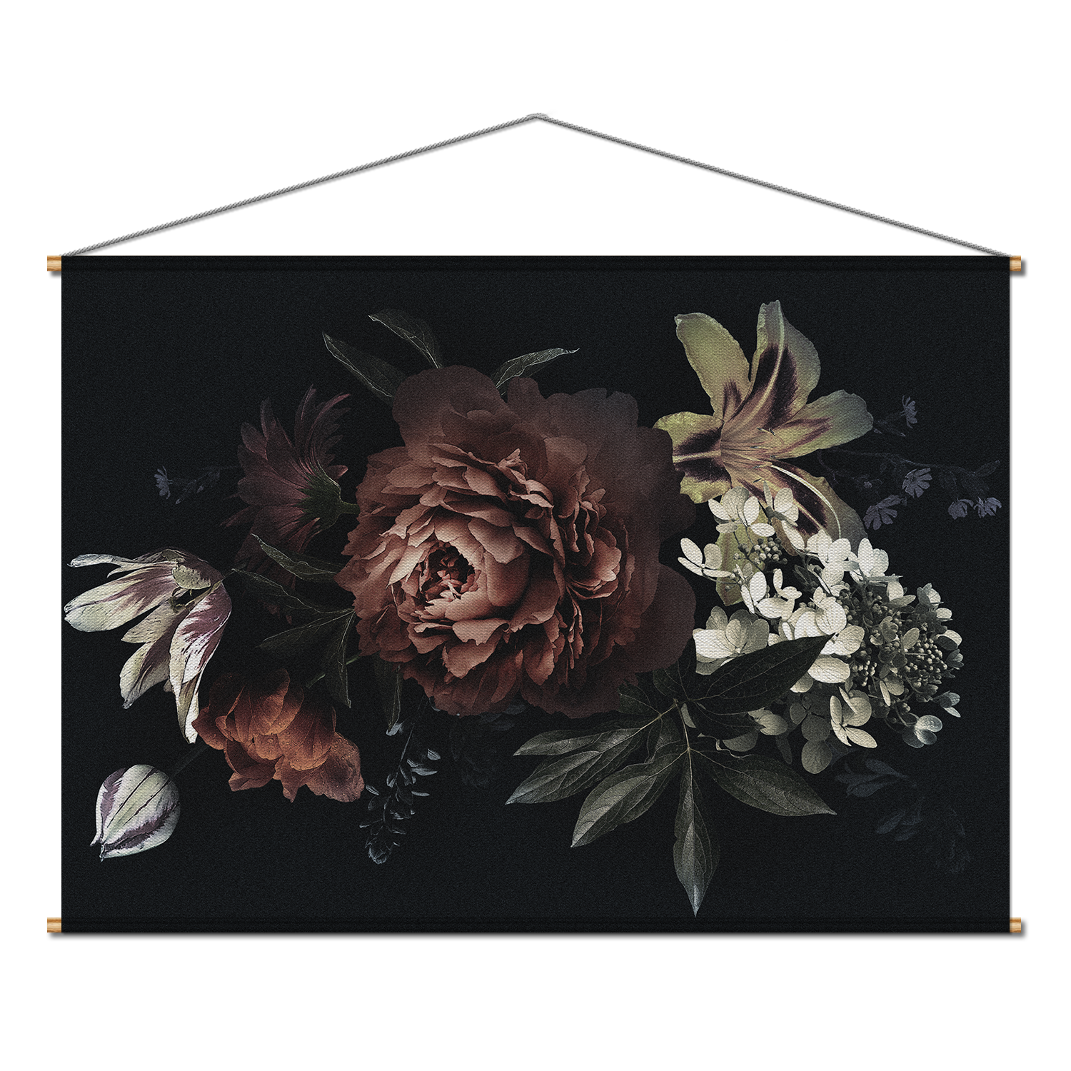 Sublimez vos murs avec le kakemono “Pivoine Nocturne”, où une pivoine majestueuse aux pétales profonds s’entrelace avec des lys clairs et un feuillage raffiné. Disponible en toile pour un rendu moderne ou en velours pour une touche de luxe et de profondeur.