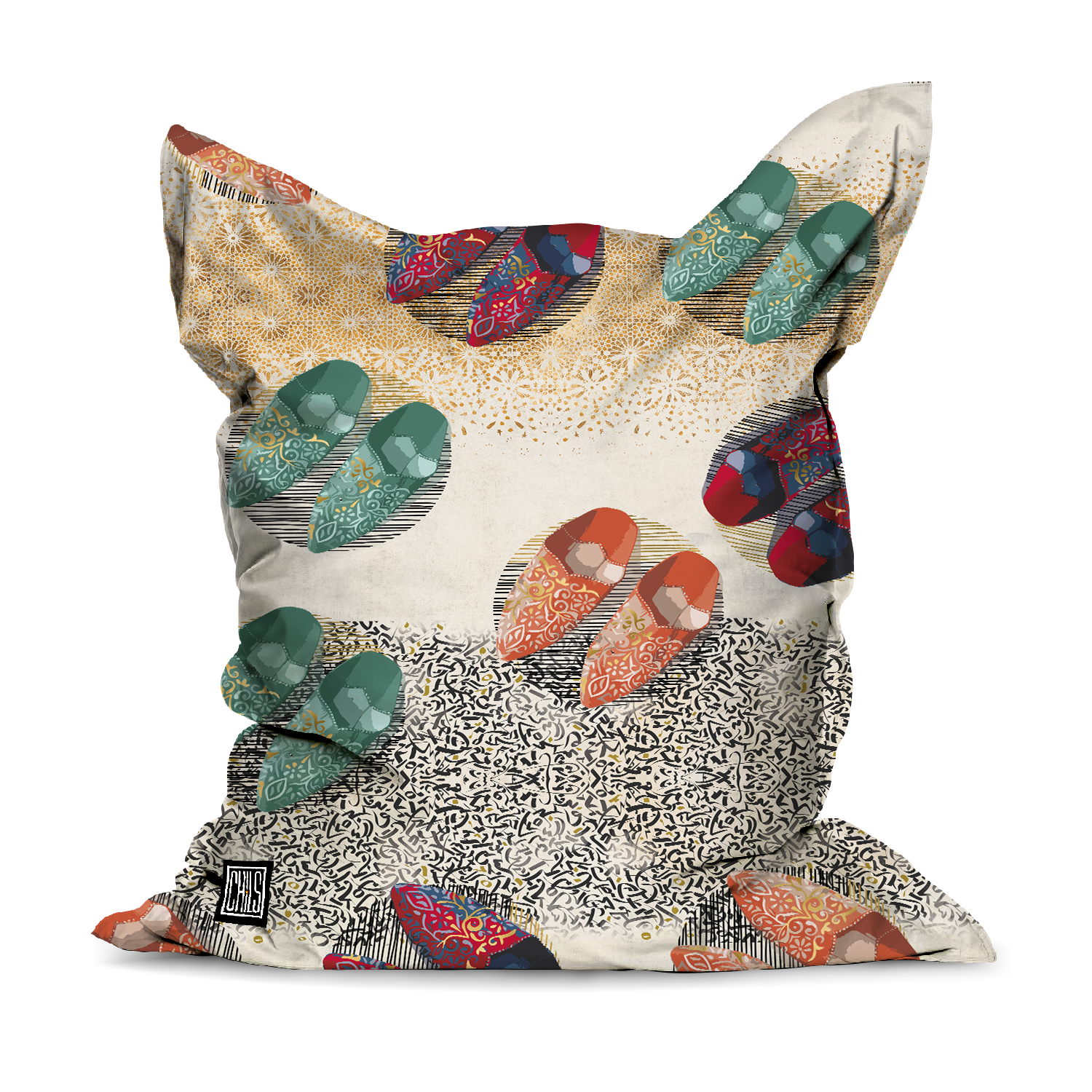Le pouf géant “Danse des Cherbils” met à l’honneur l’artisanat raffiné des babouches brodées, trésors intemporels de la culture berbère et andalouse. Son motif répète avec rythme et élégance trois paires de cherbils aux teintes vibrantes : orange lumineux, vert d’eau délicat et prune profond. Ensemble, ces couleurs créent une mosaïque vivante, un hommage au savoir-faire ancestral et à la richesse des traditions.