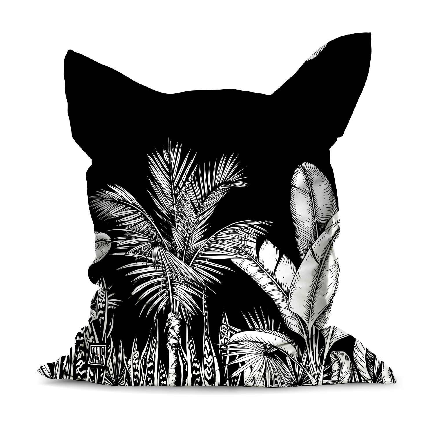 Le pouf géant “Tropiques Luxuriantes – Noir Intense” plonge votre espace de détente dans une atmosphère tropicale graphique et raffinée. Un motif luxuriant de palmiers, bananiers et feuillages denses, dessinés en noir et blanc sur un fond noir profond, crée un contraste saisissant et une ambiance élégante et résolument contemporaine.