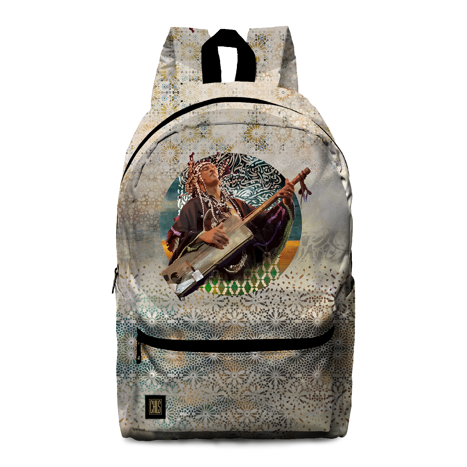 Le sac à dos “Le Gnaoui” est une ode à la culture spirituelle et musicale marocaine. Son design unique met en avant la figure d’un musicien gnaoui, symbole de sagesse et de transe sacrée, entouré de mosaïques raffinées en nuances de gris et de vert. À la croisée du pratique et du poétique, il devient un véritable objet d’art à porter au quotidien.