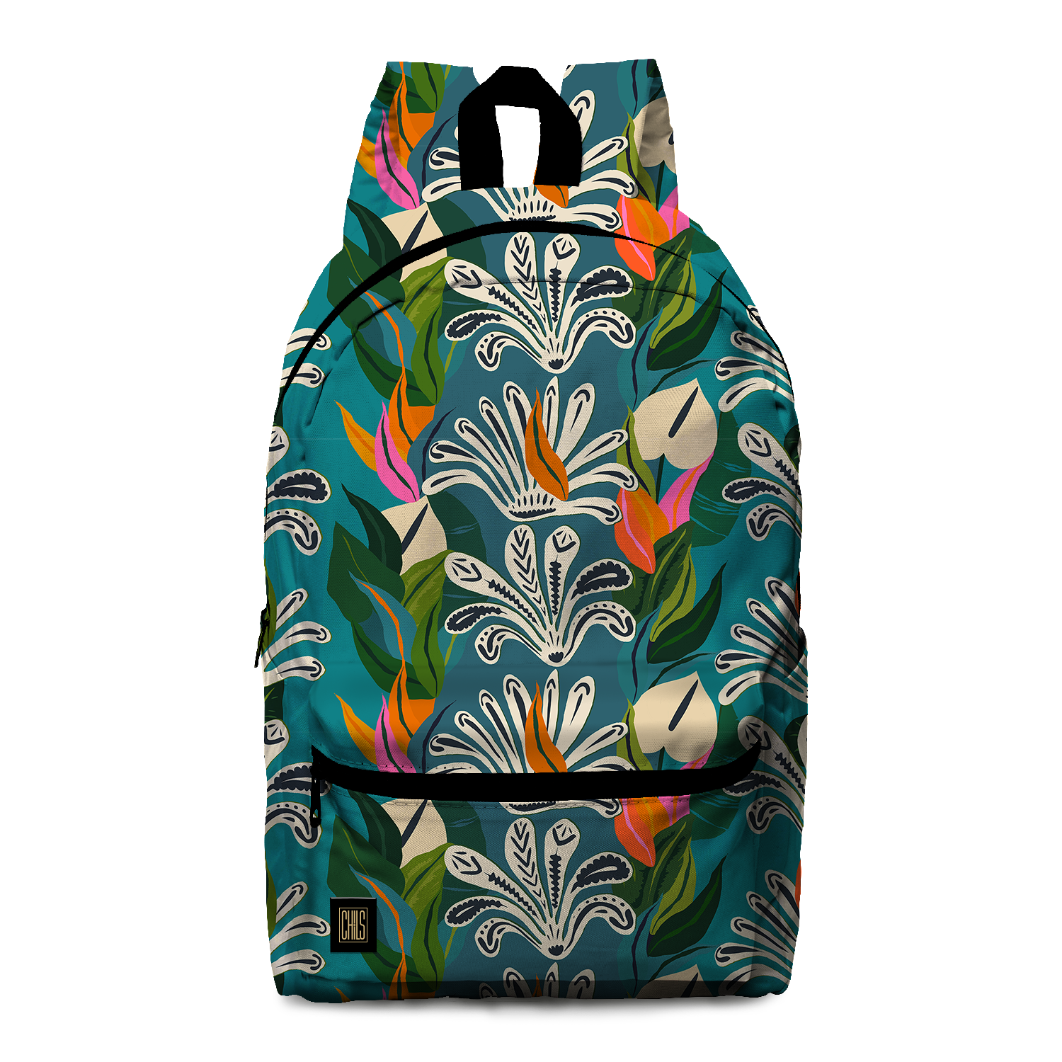 Ce sac à dos évoque un jardin tropical imaginaire avec fleurs stylisées et feuillages luxuriants sur fond turquoise lumineux. Moderne et graphique, il combine praticité et esthétisme grâce à sa poche extérieure, parfait pour un style frais et coloré.