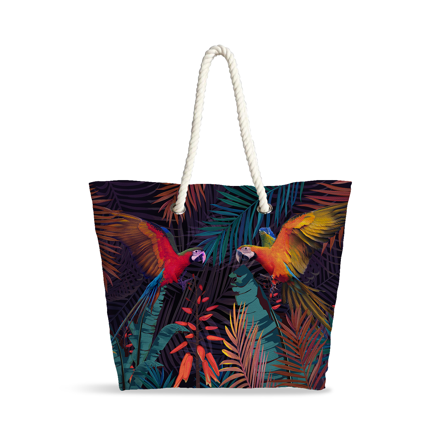 Le sac cabas “Parrots Envolés” déploie une scène tropicale animée où des perroquets colorés virevoltent parmi des feuillages luxuriants. Ce design apporte une touche d’exotisme et de fraîcheur, transformant votre cabas en un accessoire chic et vivant.