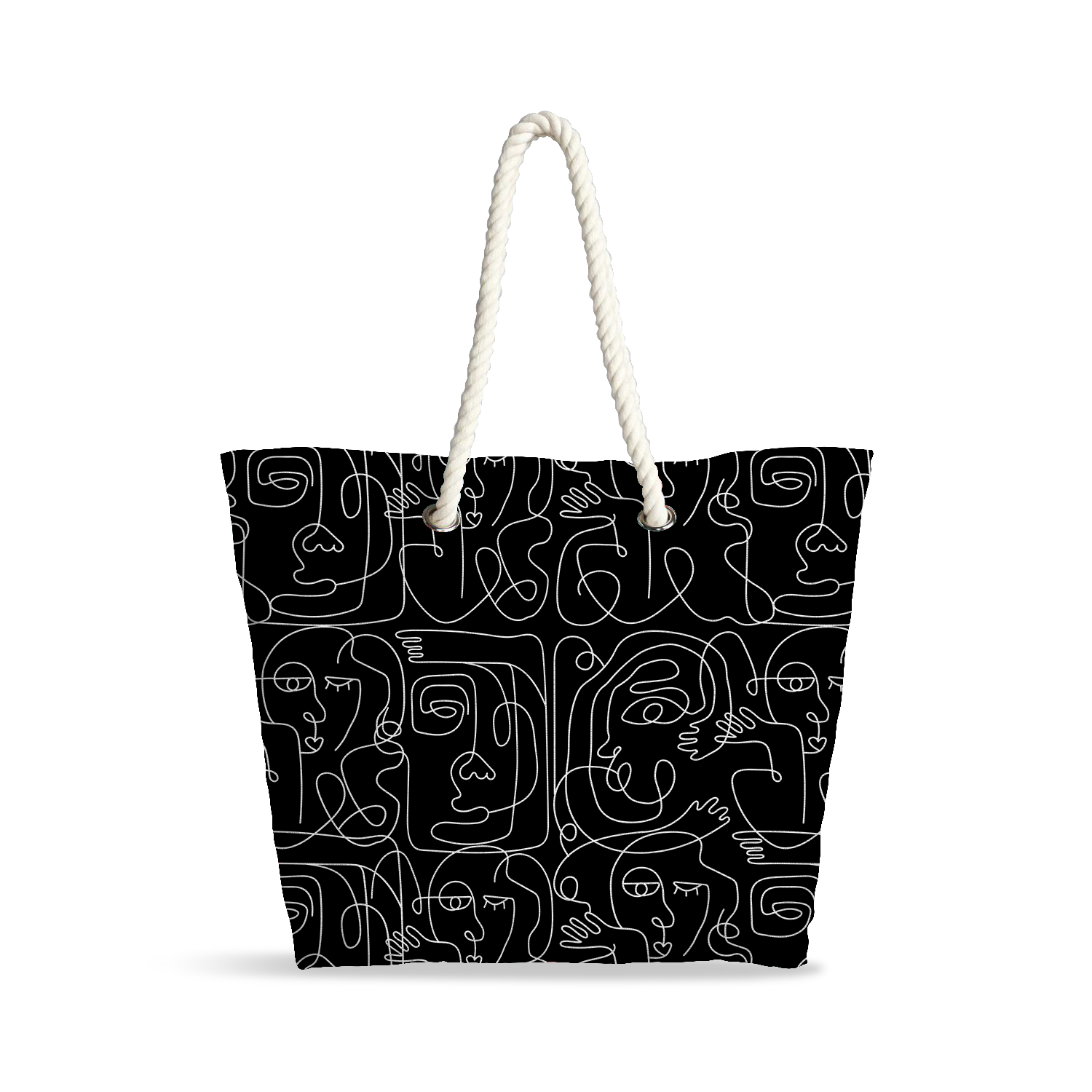 Sac Cabas | Collection One Line | Visages Carrés Abstraits – Blanc sur Fond Noir