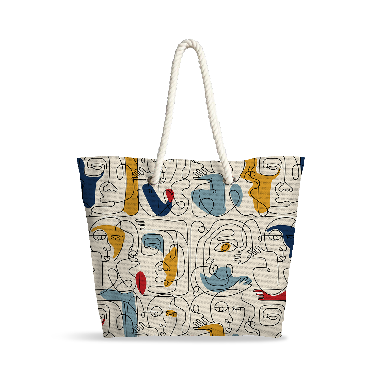 Sac Cabas | Collection One Line | Visages Carrés Abstraits Colorés – Fond Beige