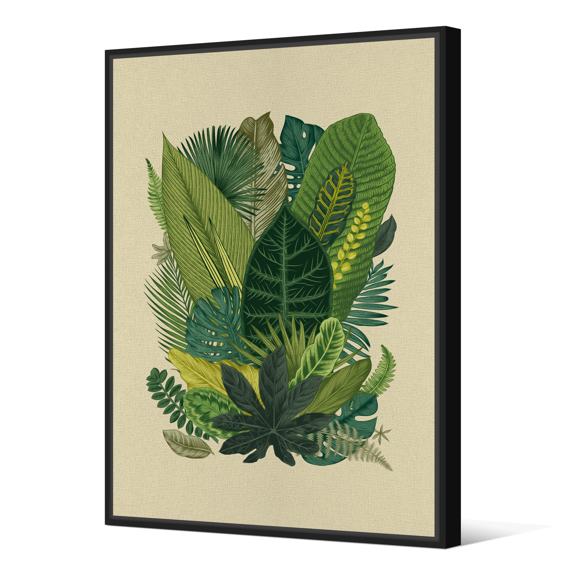 Ce tableau avec cache clou de la Collection Amazonia Jungle met en avant un bouquet de feuillages tropicaux graphiques et sophistiqués. Palmiers, monstera, bananiers, fougères et philodendrons se superposent dans une composition centrée et élégante, avec des touches lumineuses de jaune-vert sur fond beige texturé. Le style contemporain et épuré évoque l’esthétique “urban jungle” et les herbiers botaniques modernes, apportant fraîcheur, dynamisme et raffinement à tout intérieur.