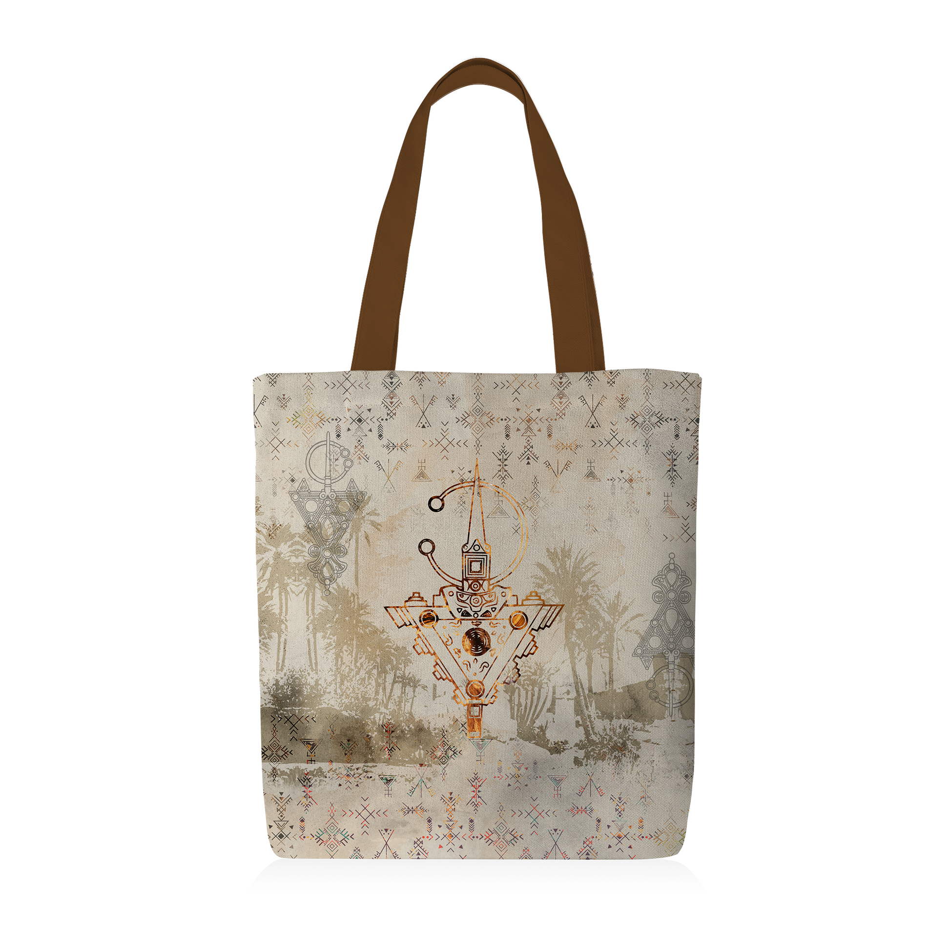 Le tote bag “Fibule” rend hommage à l’un des symboles les plus emblématiques de la culture berbère. Son design met en avant une fibule stylisée, véritable bijou traditionnel utilisé à la fois comme parure et comme talisman protecteur. Les tons ocre, orange cuivré et noir apportent chaleur et caractère, tandis que le fond gris clair est subtilement orné de palmiers en arrière-plan, pour un effet raffiné et narratif.