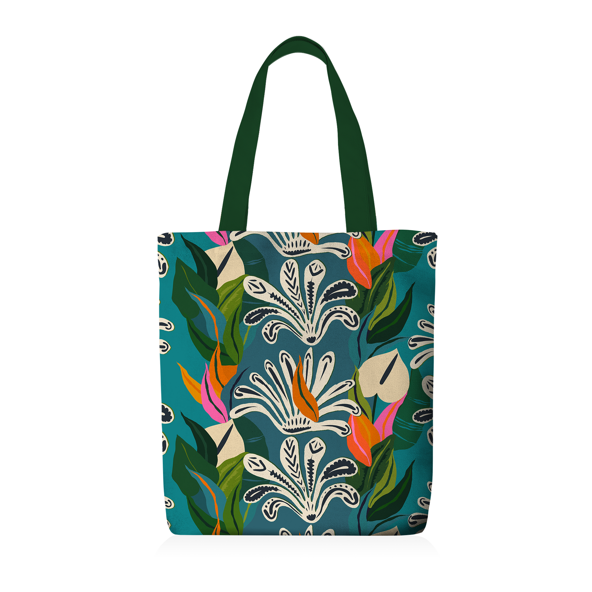 Apportez couleur et dynamisme à votre quotidien avec le tote bag “Jardin Tropical Stylisé”. Son motif graphique met en scène des fleurs tropicales stylisées, des feuillages luxuriants et des touches vibrantes d’orange et de fuchsia, sur un fond turquoise éclatant. Les contours noirs façon linocut apportent structure et rythme à la composition, tandis que les formes semi-abstraites et géométriques créent un motif moderne et joyeux.