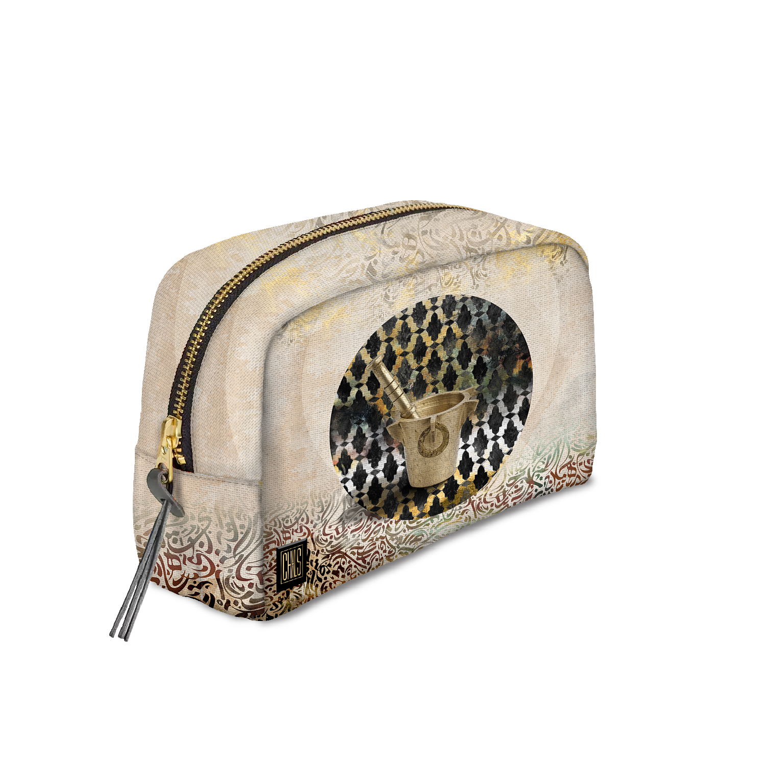 La trousse classique de la collection Berbère s’inspire du motif “Mortier Traditionnel”, où l’artisanat marocain et les zelliges se rencontrent dans un cercle harmonieux. Son design évoque la tradition, la convivialité et la richesse culturelle, transformant un objet du quotidien en accessoire chargé de sens.