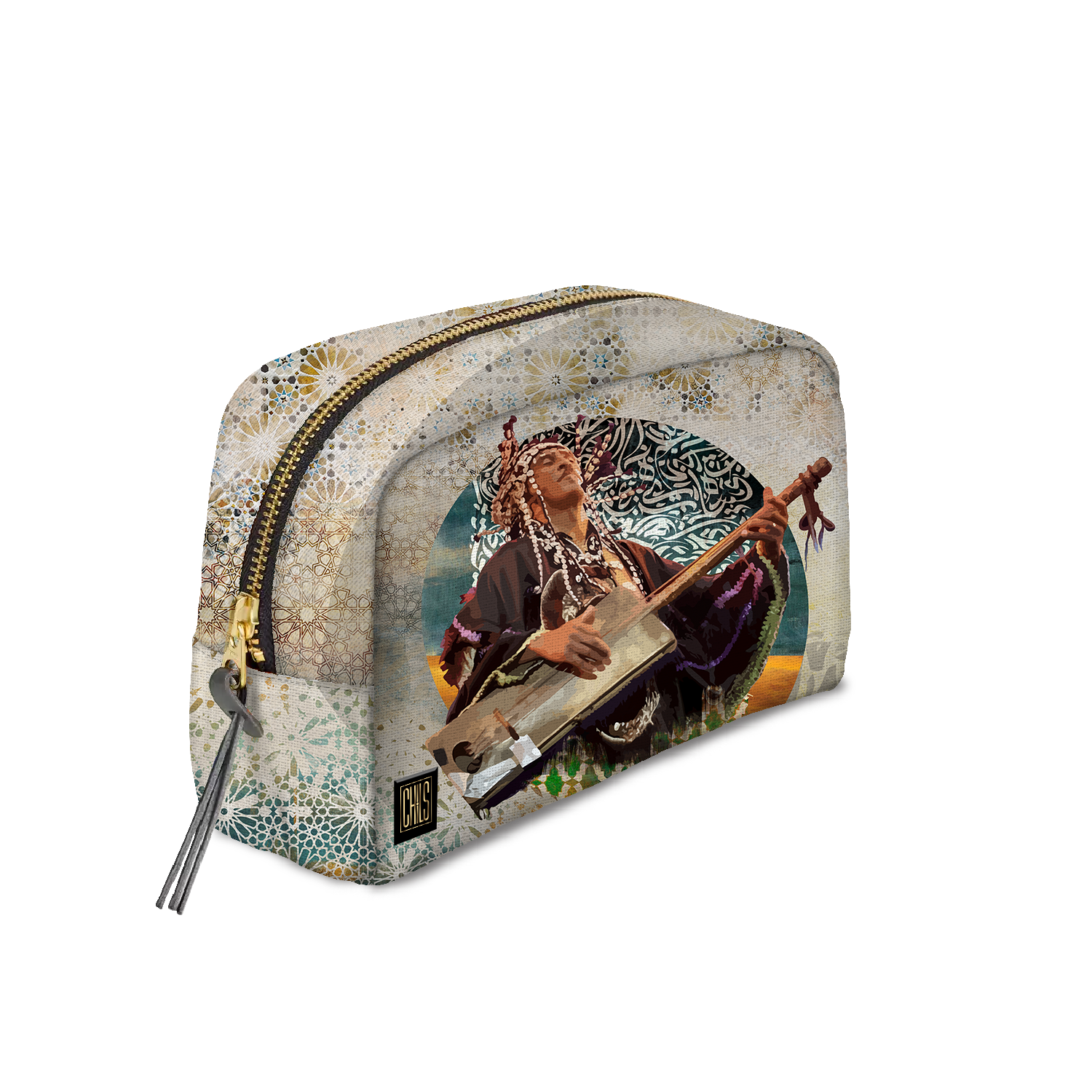 La trousse classique de la collection Berbère s’inspire du motif “Le Gnaoui”, où la musique et la spiritualité des maîtres gnaouis se mêlent aux zelliges et mosaïques marocaines. Son design évoque la sagesse, la protection et l’héritage culturel, transformant un accessoire du quotidien en objet poétique et symbolique.
