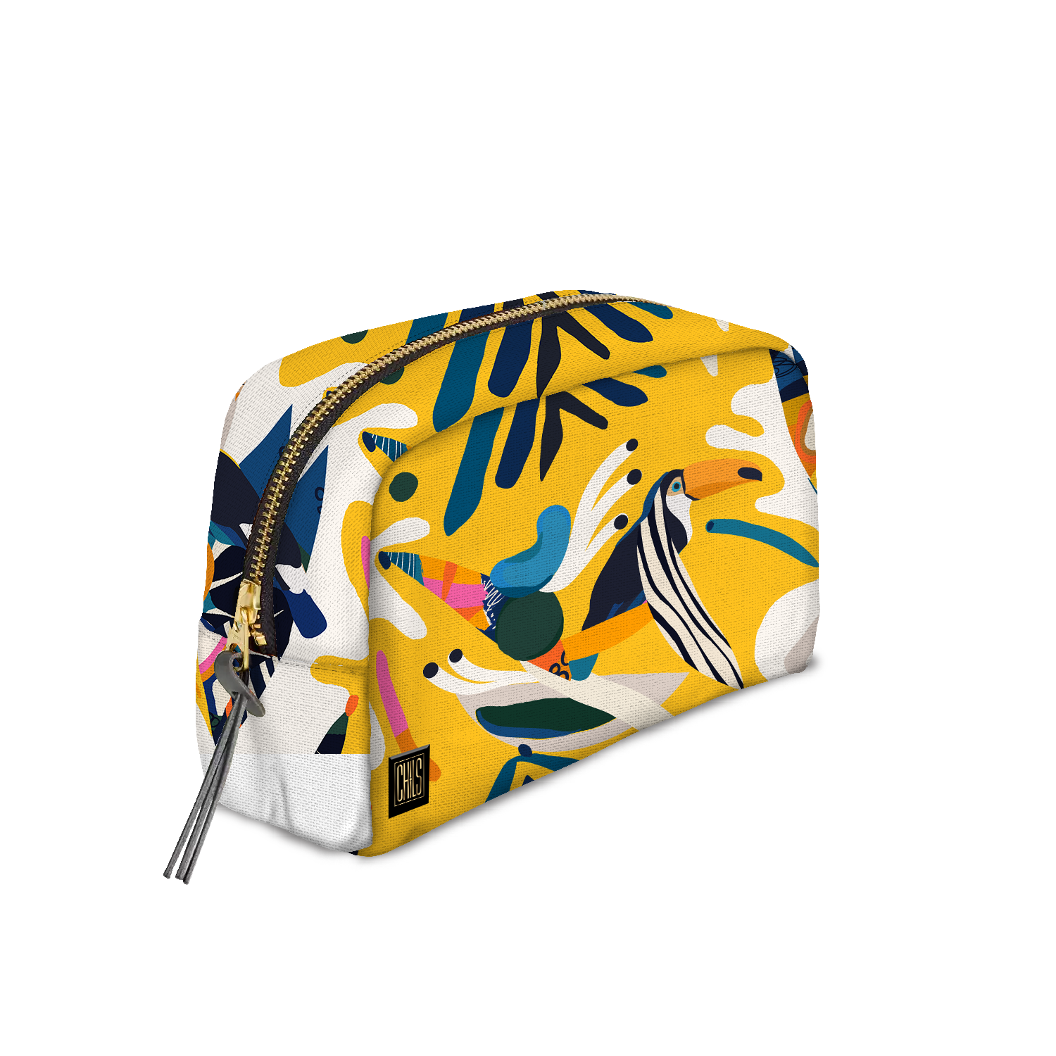 La trousse Toucans Ludiques séduit par son motif tropical joyeux et audacieux. De charmants toucans stylisés, aux formes géométriques modernes, se détachent sur un fond jaune éclatant, accompagnés de feuillages tropicaux et de touches colorées de turquoise, rose vif, orange et vert émeraude. L’ensemble crée une composition à la fois ludique, contemporaine et pleine d’énergie, parfaite pour ajouter une touche d’originalité à vos essentiels du quotidien.