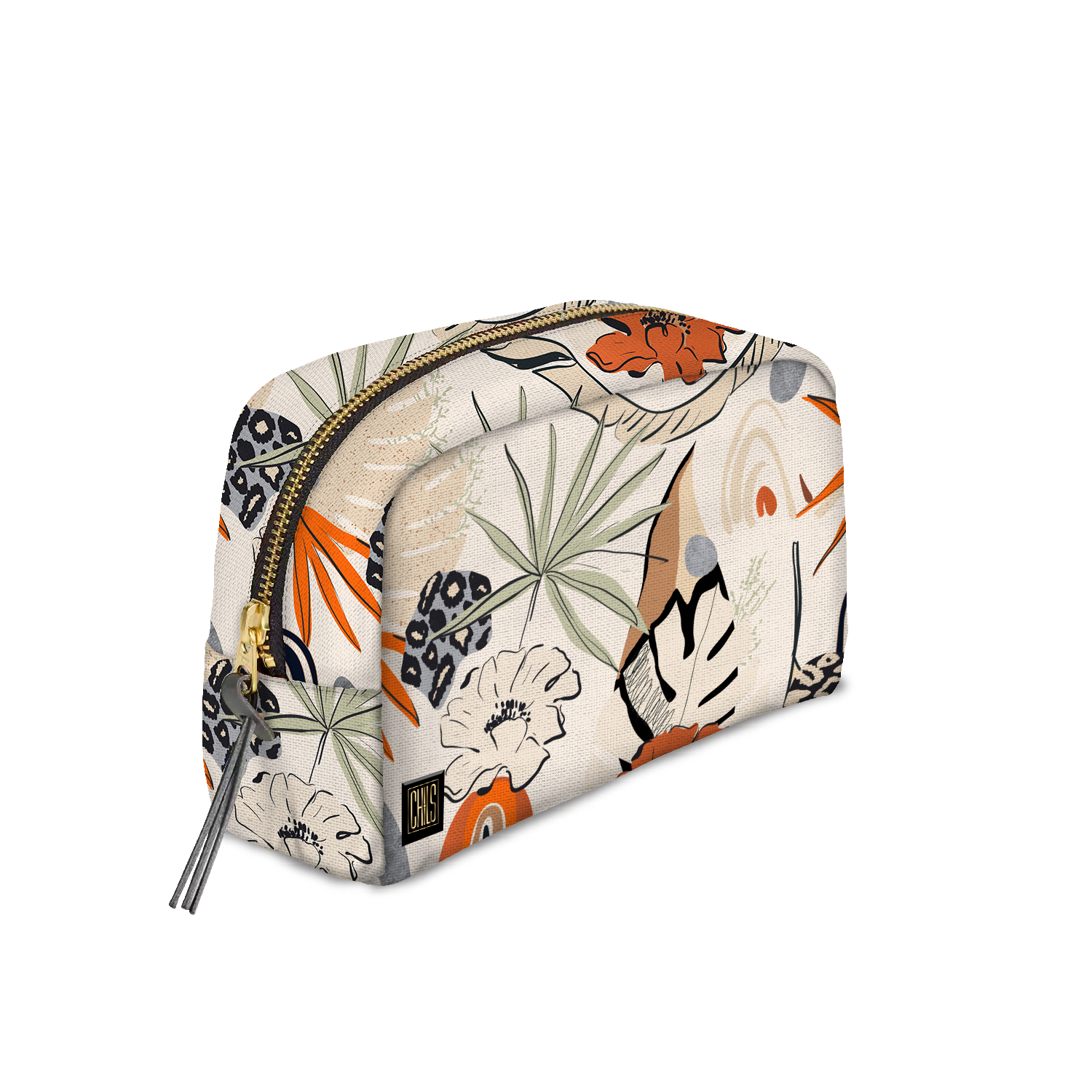 La trousse Harmonie Sauvage séduit par son motif tropical graphique et raffiné. Sur un fond écru lumineux, des fleurs stylisées, des palmes élancées et des feuillages abstraits s’entrelacent avec subtilité. Les touches d’orange vif, de vert tendre et de noir profond viennent dynamiser l’ensemble, tandis que les nuances beiges et grises adoucissent le contraste.
