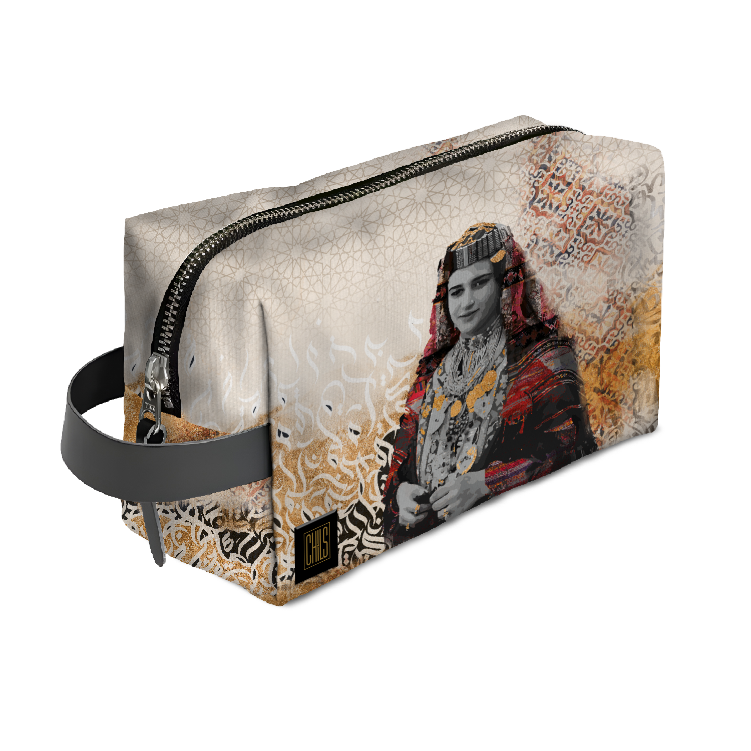 La trousse de voyage “Héritage Nomade” rend hommage à l’élégance et à la force des traditions berbères. Son design raffiné met en avant la silhouette majestueuse d’une femme parée d’un melhef en soie, d’une 3assaba traditionnelle et de bijoux ancestraux, symboles d’identité et de transmission.