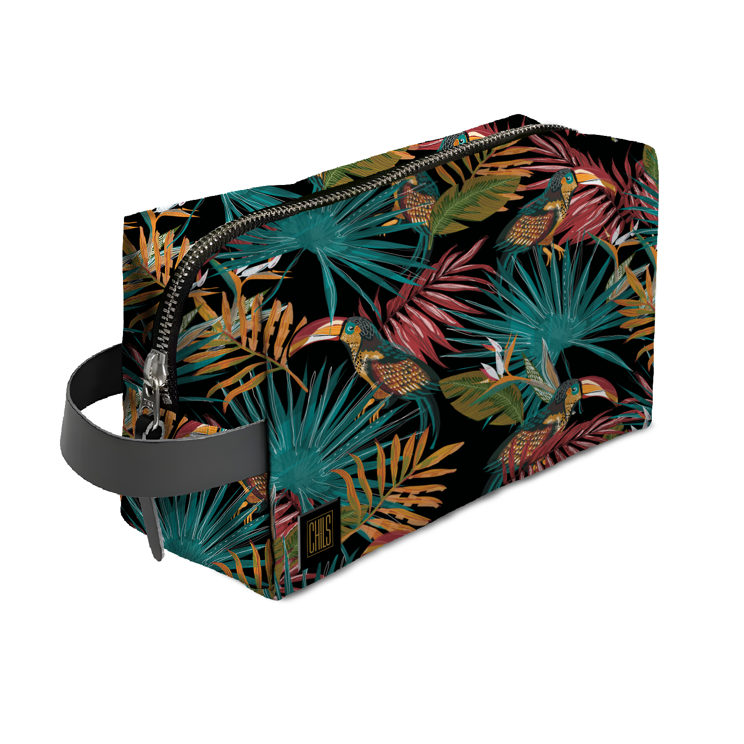 La trousse “Calaos Éclatant” illumine vos accessoires avec des oiseaux tropicaux aux couleurs vibrantes sur fond clair, mêlant exotisme et raffinement dans un design dynamique.