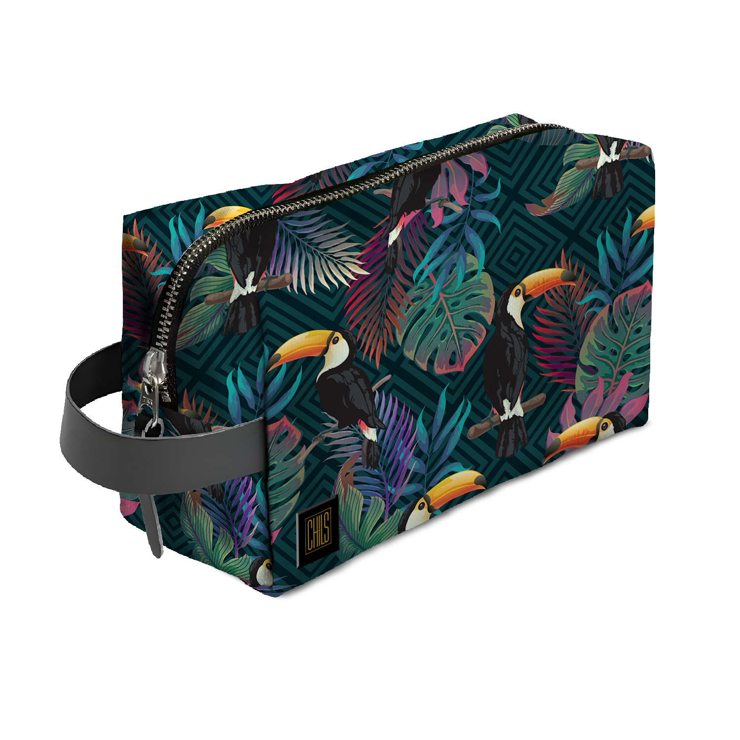 La trousse “Calaos et Carreaux Infini” allie élégance graphique et exotisme avec un motif raffiné de calaos entourés de motifs géométriques inspirés des carreaux traditionnels. Un accessoire pratique et artistique pour vos déplacements.