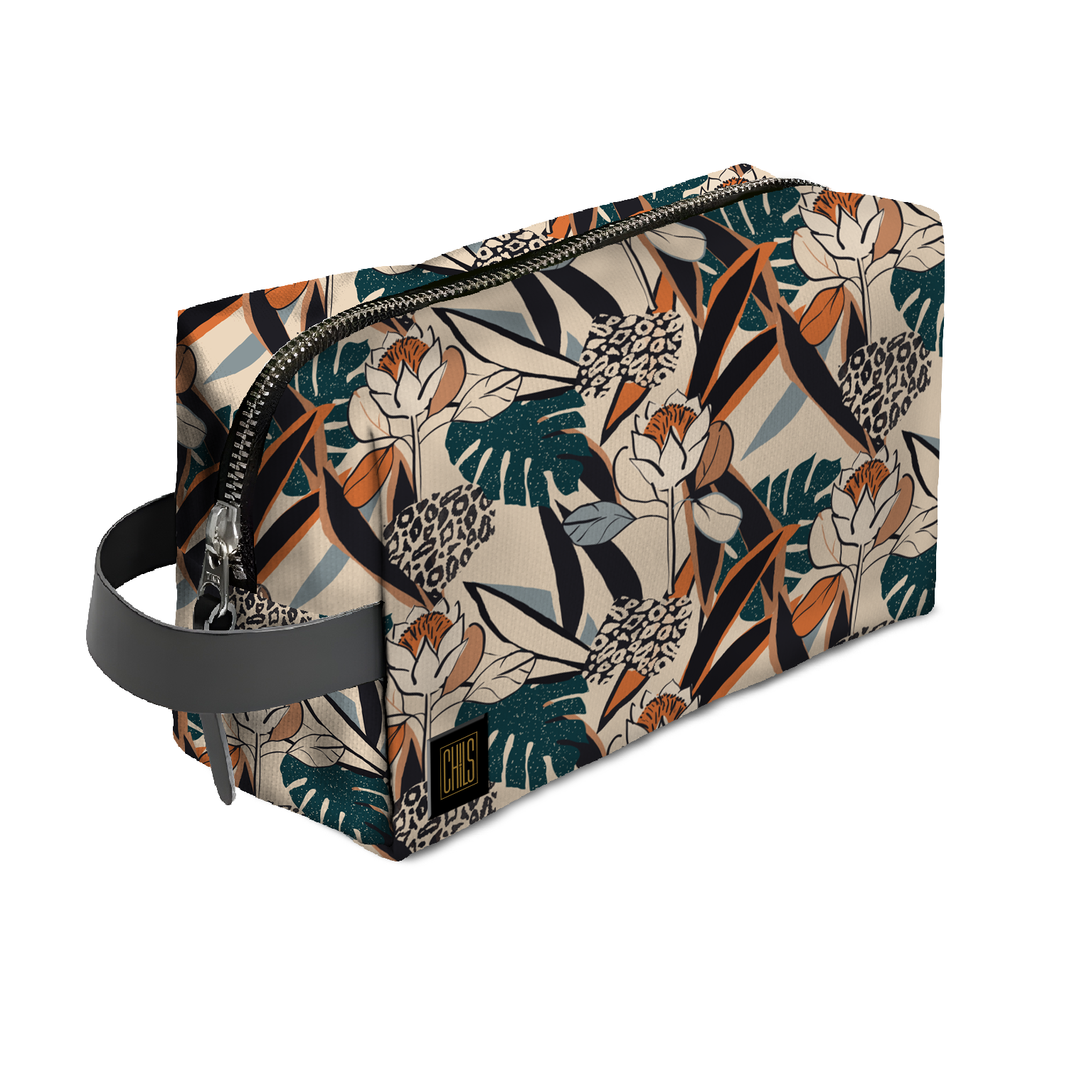 La trousse “Éclat Tropical” se distingue par ses couleurs vives et ses motifs de feuillages et fleurs exotiques, apportant énergie et style à votre trousse de voyage.