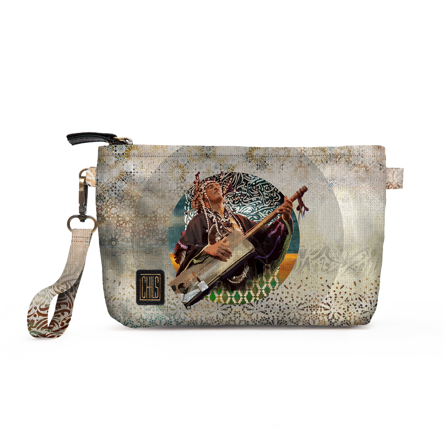 La trousse vanity “Le Gnaoui” rend hommage à l’héritage spirituel et musical des maîtres gnaouis. Son design met en scène un musicien gnaoui, entouré de zelliges et mosaïques raffinés dans des tons de gris et de vert, créant une composition à la fois poétique, protectrice et élégante. Plus qu’un simple accessoire, cette trousse incarne la sagesse et la profondeur de la culture marocaine, tout en restant pratique et moderne.