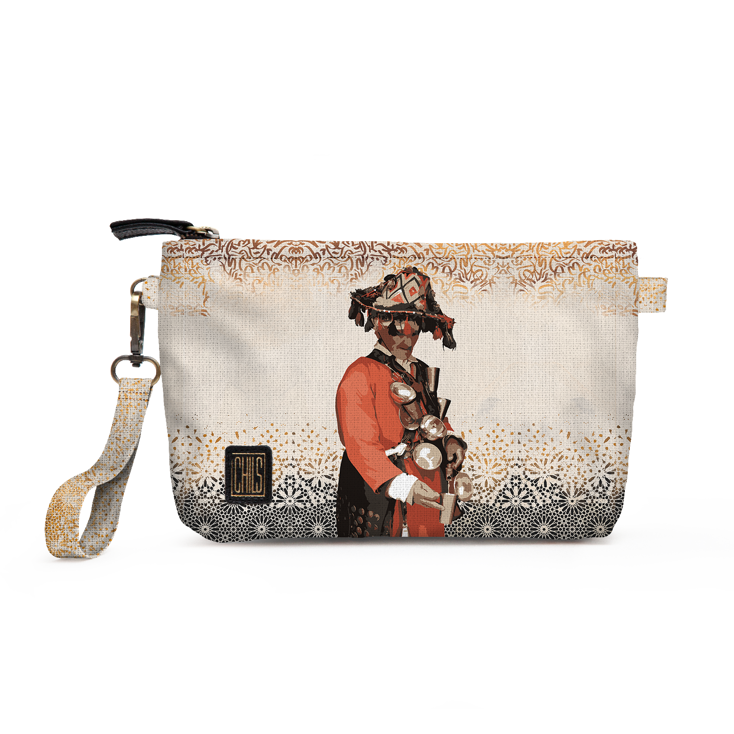 La trousse vanity “Guerrab” célèbre le porteur d’eau marocain, symbole d’hospitalité, générosité et traditions ancestrales. Le design met en scène le guerrab en mouvement, ses jarres iconiques sur les épaules, entouré de motifs géométriques et de couleurs chaudes évoquant les médinas et les places animées. Un hommage poétique à l’art de vivre marocain, à la fois authentique et contemporain.