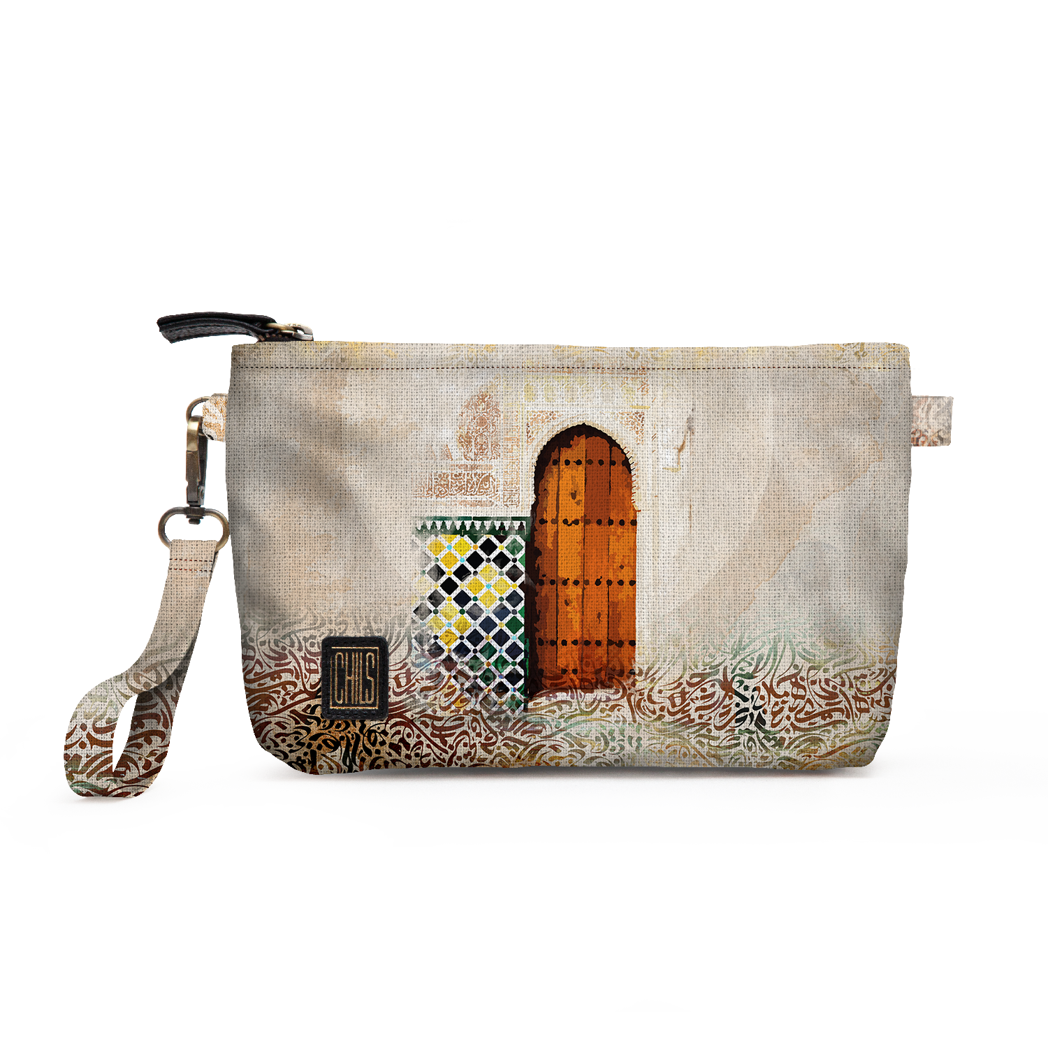 La trousse vanity “La Porte Sacrée” célèbre l’architecture et l’artisanat marocain à travers une majestueuse porte en bois clouté, encadrée de zelliges colorés et de délicats motifs calligraphiques. Symbole de protection, de mystère et d’héritage culturel, son design raffiné transforme cet accessoire en un véritable écrin où tradition et modernité s’entrelacent.