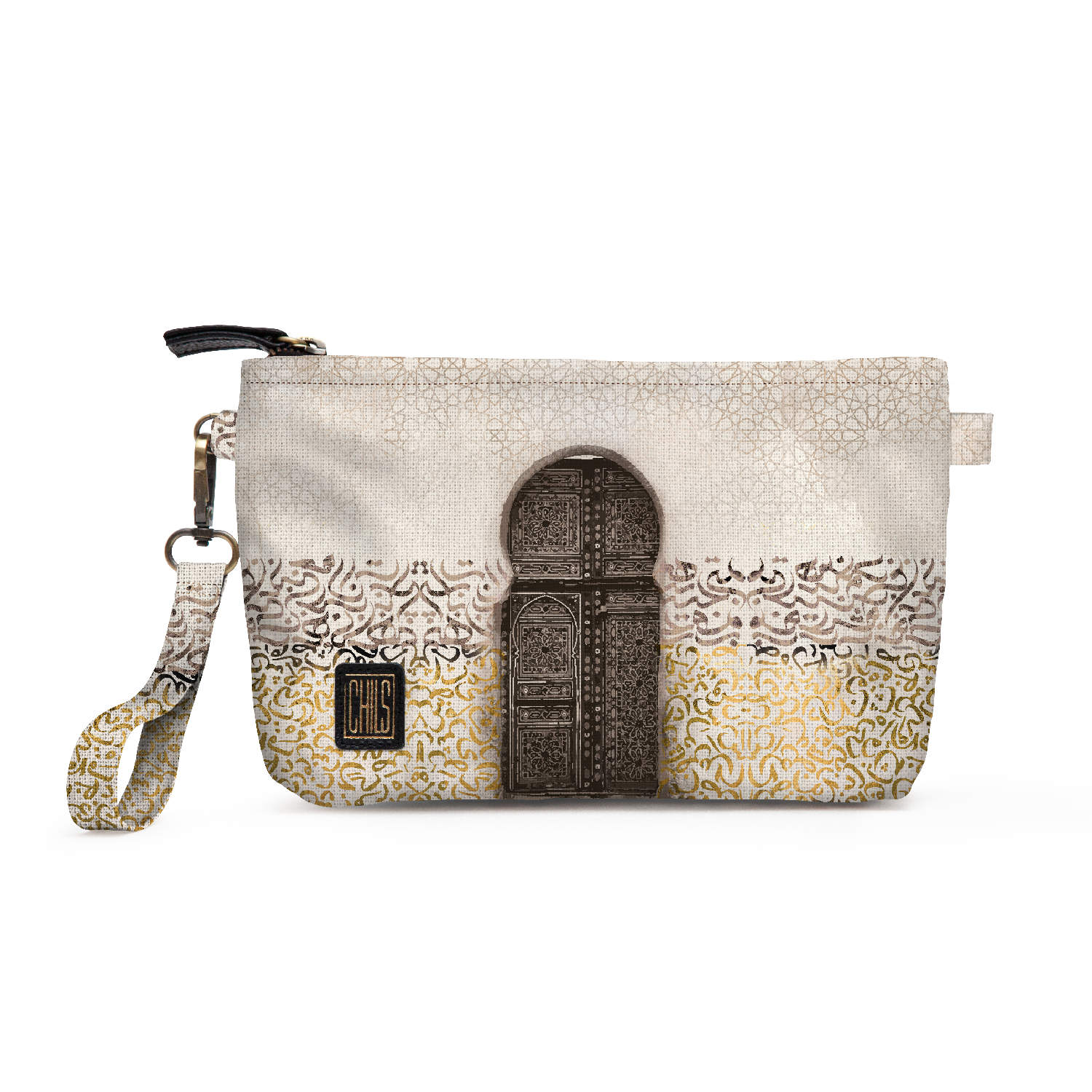 La trousse vanity “Porte des Ancêtres” rend hommage au patrimoine architectural marocain en s’inspirant d’une porte en bois brun, symbole de tradition, de transmission et de mystère. Son design se distingue par un jeu raffiné de calligraphies arabes : en noir à la base, en doré lumineux au centre et en gris estompé en haut, créant un effet de profondeur et de poésie sur un fond beige doux et intemporel.