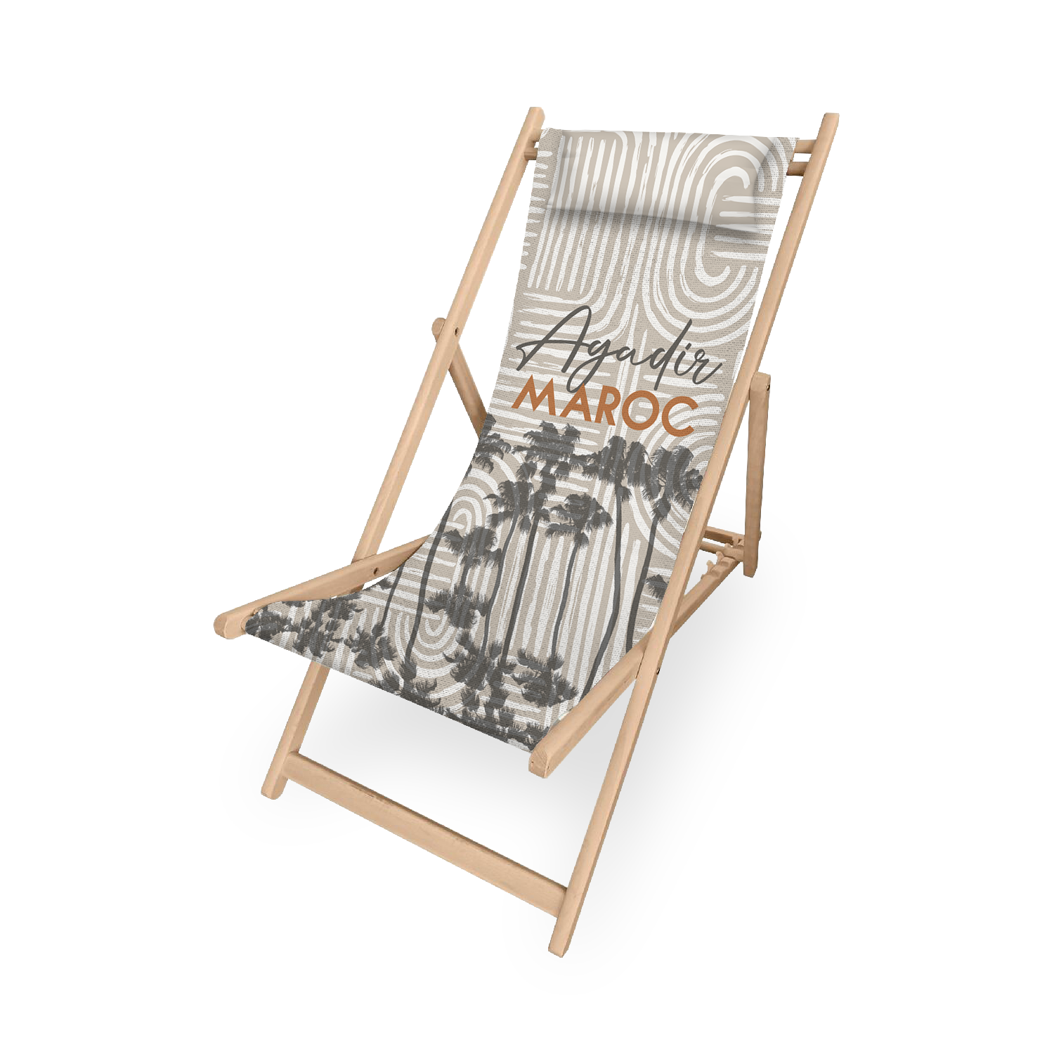 La chilienne de la collection Muted Tones revisite l’élégance marocaine dans une version contemporaine. Son motif de traits arrondis, inspiré d’une porte traditionnelle, s’étend en tons beige doux sur fond clair, créant une atmosphère apaisante et raffinée. En partie basse, des palmiers gris foncé apportent une note naturelle, tandis que l’inscription Agadiren gris aérien et Maroc en orange lumineux ajoute une touche moderne et solaire.