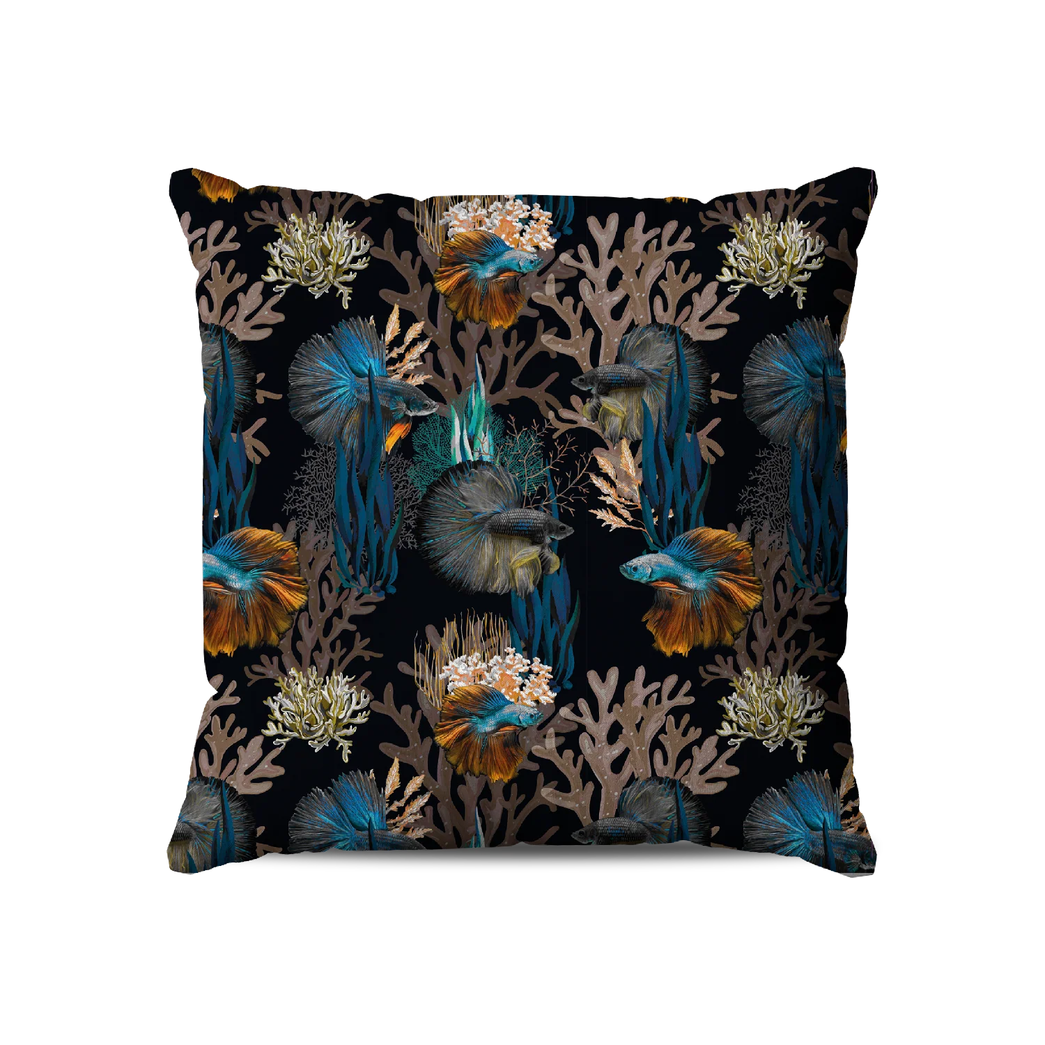 Le coussin “Abysses Dorées” de la collection Aquarium capture l’âme mystérieuse des grands fonds. Des poissons Betta aux reflets bleus et orangés évoluent librement parmi des coraux rosés et des algues turquoise, sur un fond noir profond et enveloppant. Un motif all-over somptueux et envoûtant, qui fait entrer la magie des abysses dans votre intérieur.