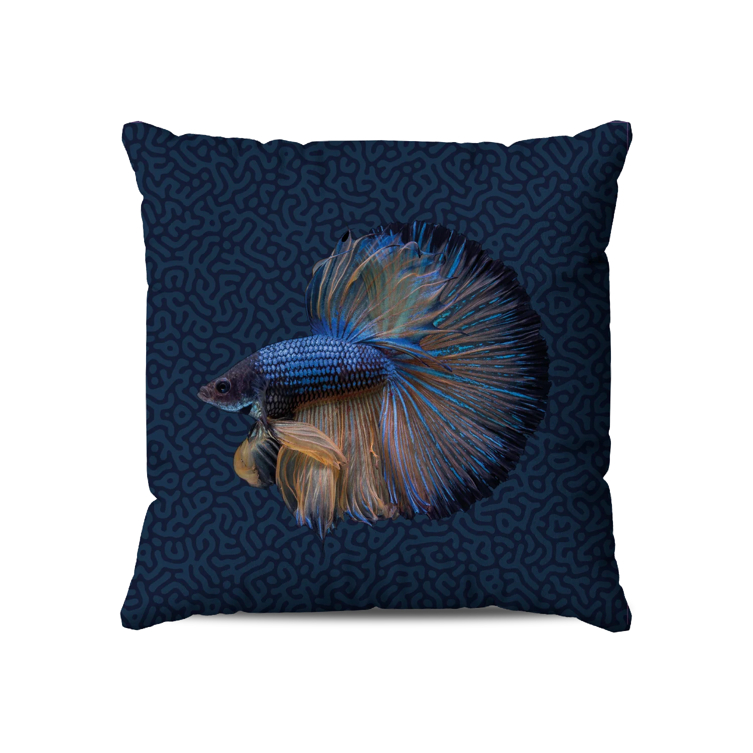 Le coussin “Betta Royal” de la collection Aquarium célèbre la majesté solitaire du poisson Betta dans toute sa splendeur. Sur un fond bleu marine profond subtilement habillé d’un motif corallien en filigrane, un Betta aux écailles bleues irisées déploie ses nageoires somptueuses mêlant bleu électrique, cuivré et doré, dans un portrait hyperréaliste d’une beauté saisissante. Une pièce décorative noble et envoûtante, digne d’une galerie d’art.