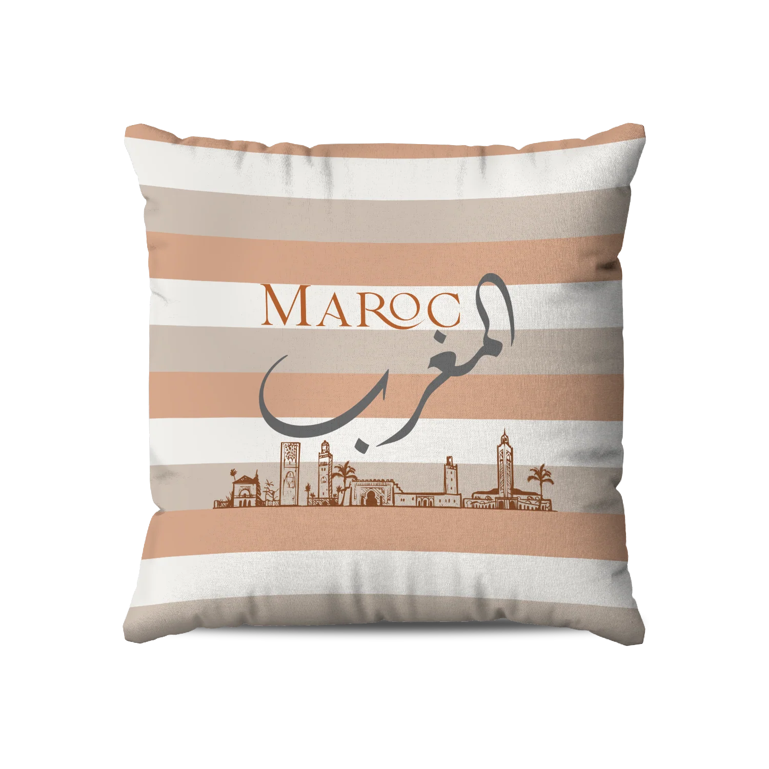 Le coussin “Monuments du Maroc – Almaghrib Maroc” de la collection Muted Tones rend hommage au patrimoine architectural marocain dans une composition graphique et contemporaine. Un fond de rayures répétées en terracotta, gris et blanc crée un rythme visuel subtil et structuré, sur lequel se détachent en monochrome les monuments emblématiques du royaume — la Menara, la Koutoubia, la porte de Meknès, la mosquée de l’Échouât et la Grande Mosquée de Casablanca — ponctués de palmiers discrets et poétiques. Au centre, المغرب en arabe gris et Maroc en lettres rouille aériennes tissent un lien subtil et élégant entre héritage et modernité.