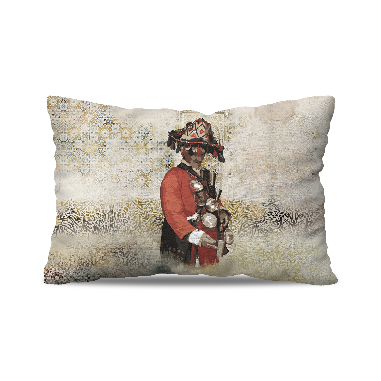 Apportez chaleur, histoire et élégance à votre intérieur avec le coussin rectangle “Le Guerrab”. Son motif met en valeur le Guerrab, figure emblématique du porteur d’eau marocain, symbole de générosité et de transmission. La base du design présente une bande de mosaïque noire qui apporte authenticité, tandis qu’un dégradé ocre évoque la chaleur du désert et des kasbahs. La partie supérieure épurée est sublimée par une calligraphie dorée, célébrant l’importance culturelle du Guerrab dans la tradition marocaine.