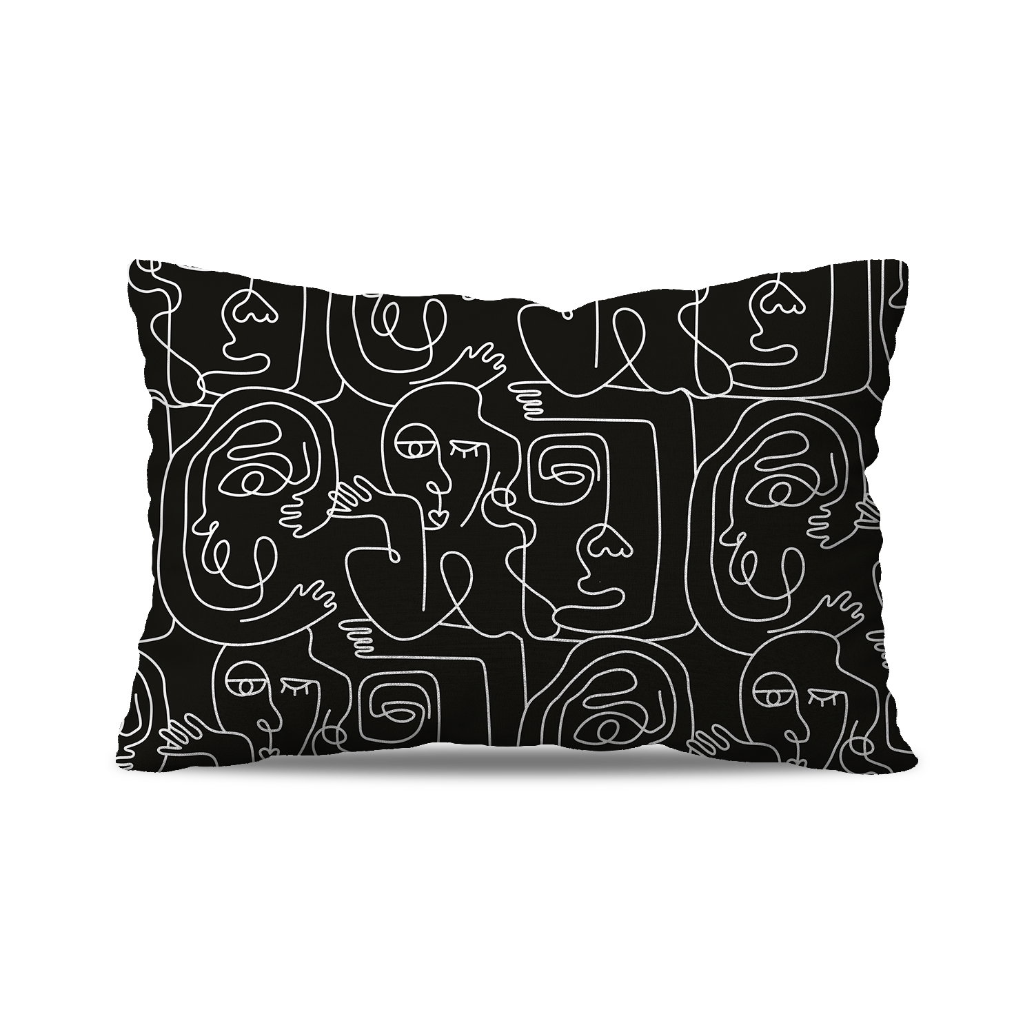 Coussin Rectangle | Collection One Line | Visages Carrés Abstraits – Blanc sur Fond Noir (Grand Format)
