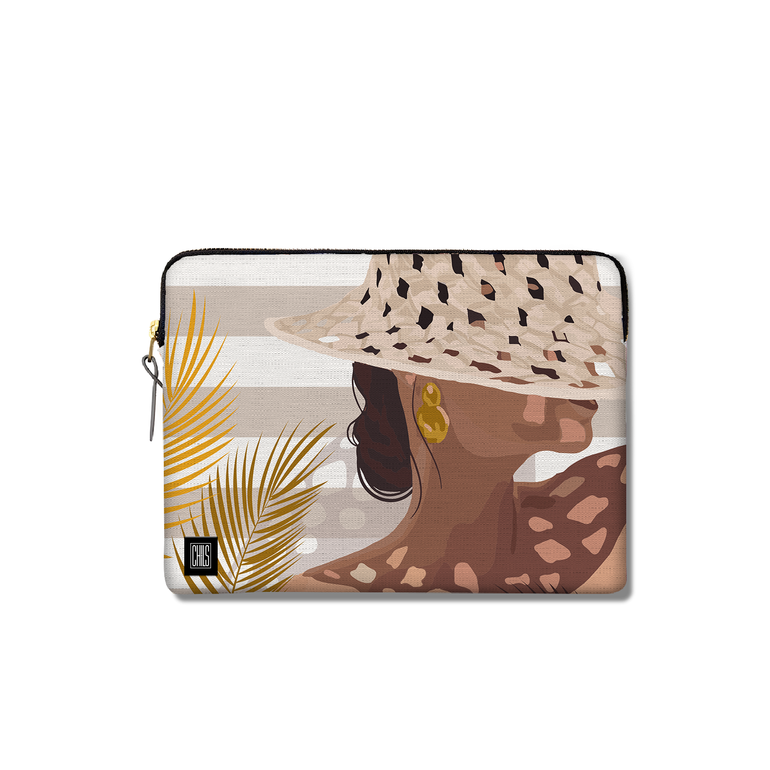 La housse “Élégance Portrait & Palmes”, issue de la collection Muted Tones, associe raffinement artistique et praticité. Son fond rayé greige et blanc met en valeur une silhouette féminine élégante : épaules et cou dégagés, chignon bas, dormeuses en or et chapeau en carnage percé dont l’ombre se projette délicatement. En premier plan, trois palmes fines – deux à gauche et une à droite – apportent profondeur et harmonie, créant une composition poétique et moderne.