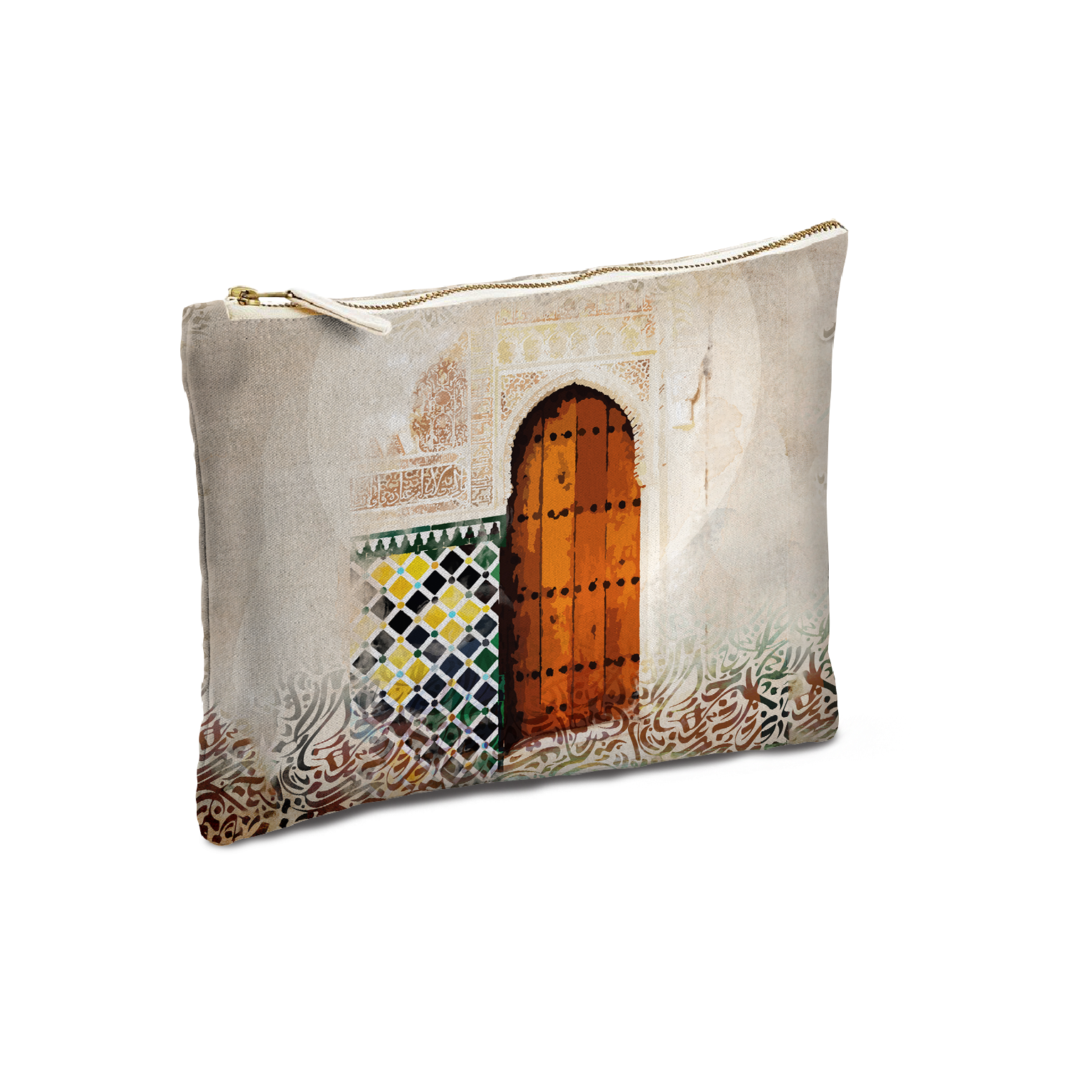 Apportez un souffle d’évasion et de tradition à vos accessoires avec la pochette “La Porte Sacrée”. Inspirée de l’architecture et de l’artisanat marocain, elle met en scène une majestueuse porte en bois clouté, entourée de zelliges colorés et de délicats motifs calligraphiques. Son design élégant évoque à la fois protection, mystère et héritage culturel, transformant chaque accessoire en un véritable petit trésor à emporter partout.
