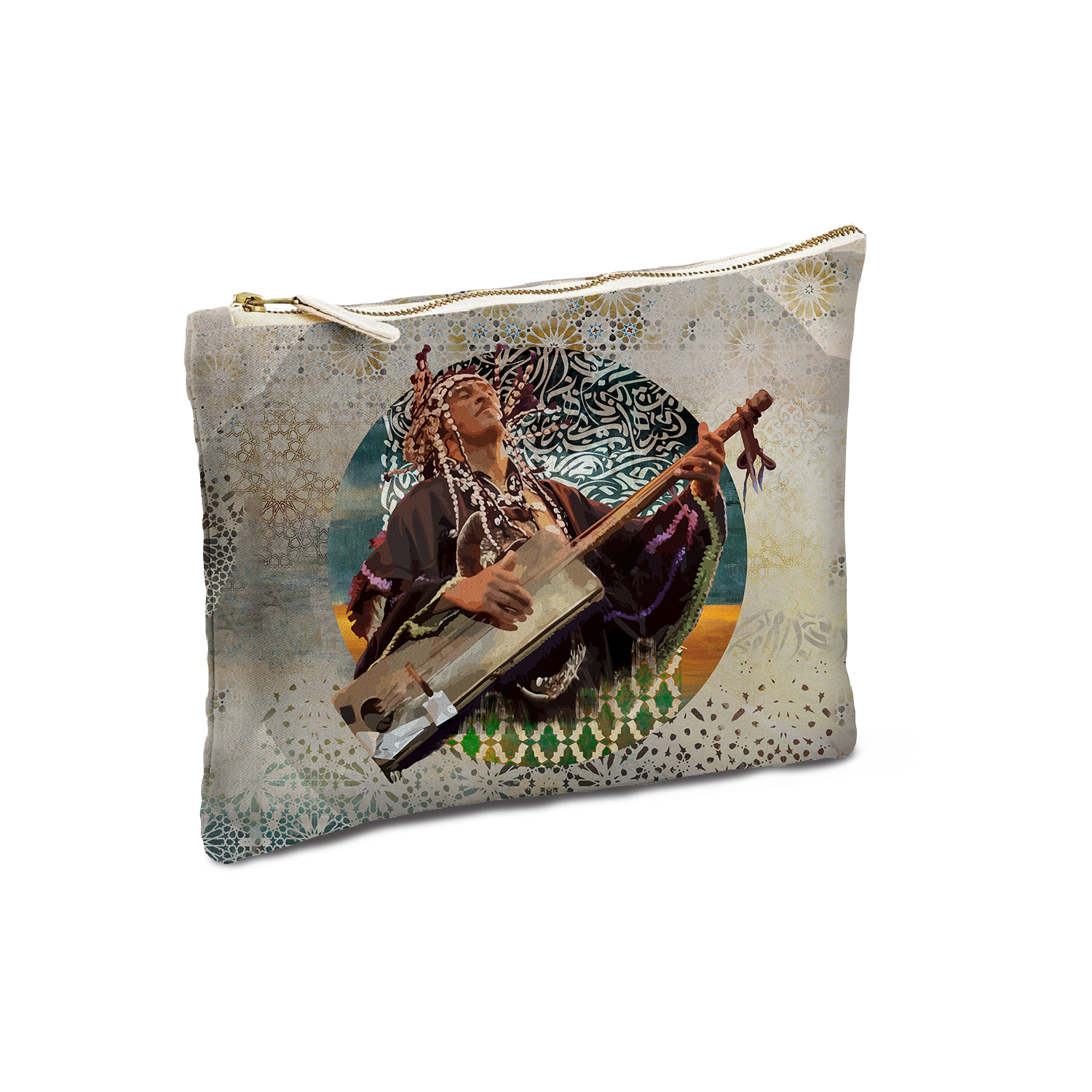 Apportez une touche spirituelle et artistique à vos accessoires avec la pochette “Le Gnaoui”. Inspirée de la profondeur culturelle et musicale des maîtres gnaouis, elle met en scène un musicien entouré de zelliges et mosaïques raffinés dans des tons de gris et de vert. Son design élégant évoque à la fois sagesse, protection et héritage marocain, transformant chaque accessoire en une pièce symbolique et poétique.