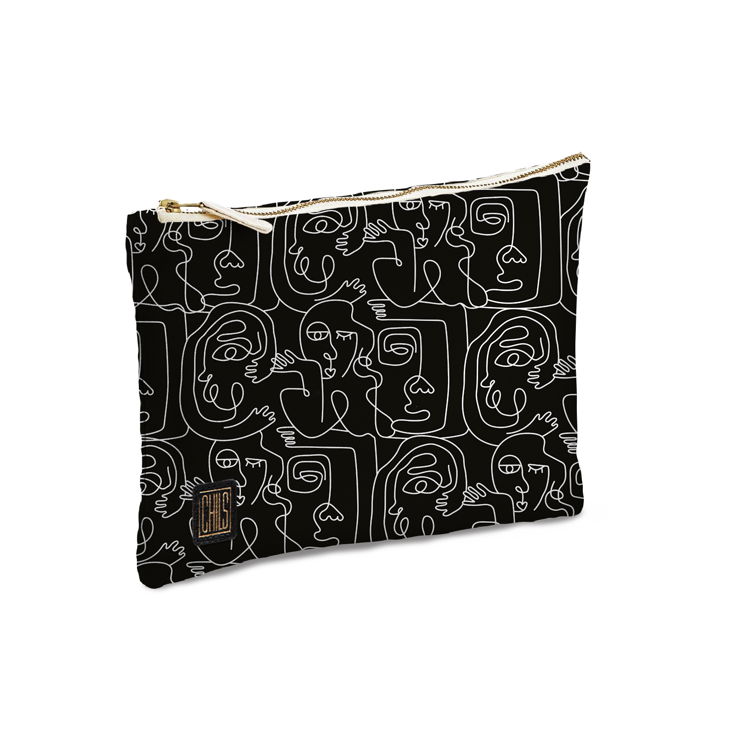 Pochette & Mini-Pochette | Collection One Line | Visages Carrés Abstraits – Blanc sur Fond Noir