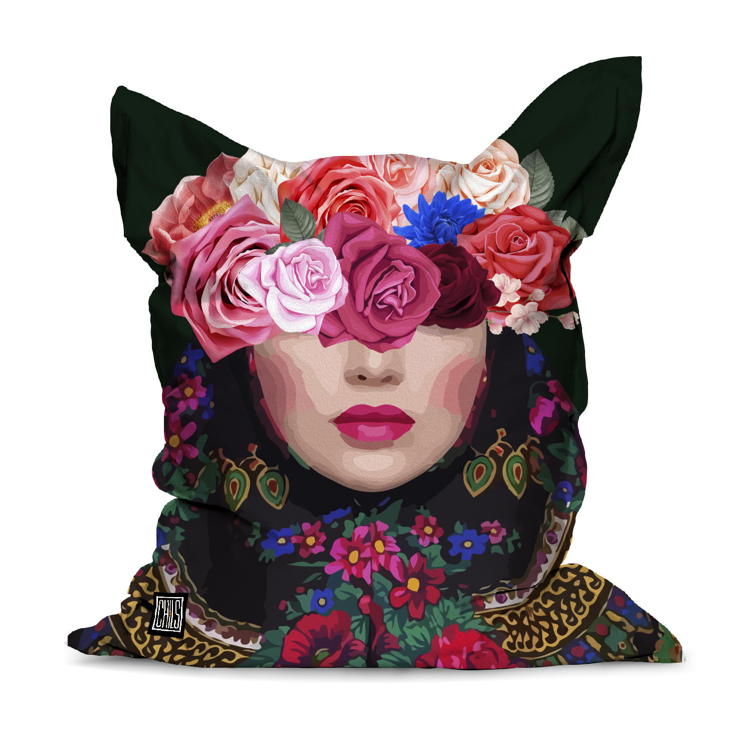 Le pouf géant “Dame aux Roses” conjugue confort et élégance artistique. Son design raffiné présente une silhouette féminine ornée d’une couronne de roses rouges, roses et blanches, sur un fond noir profond. Les détails floraux et les touches dorées apportent sophistication et poésie à votre intérieur.