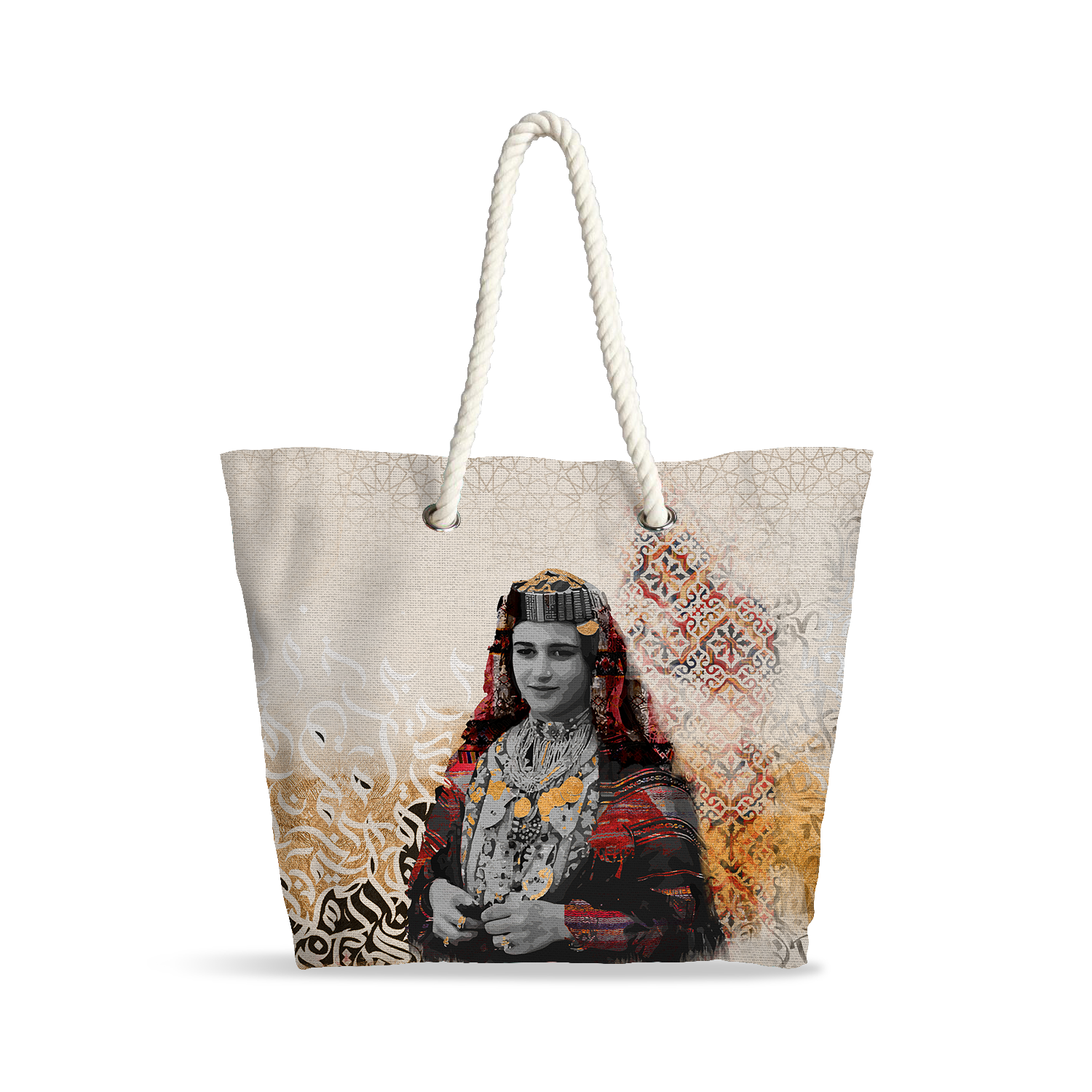 Le sac cabas “Héritage Nomade” met à l’honneur la beauté et la richesse culturelle des femmes berbères. Son design raffiné illustre une femme drapée dans un melhef en soie, coiffée d’une 3assaba traditionnelle et ornée de bijoux ancestraux, incarnant toute l’élégance et la force des traditions marocaines.