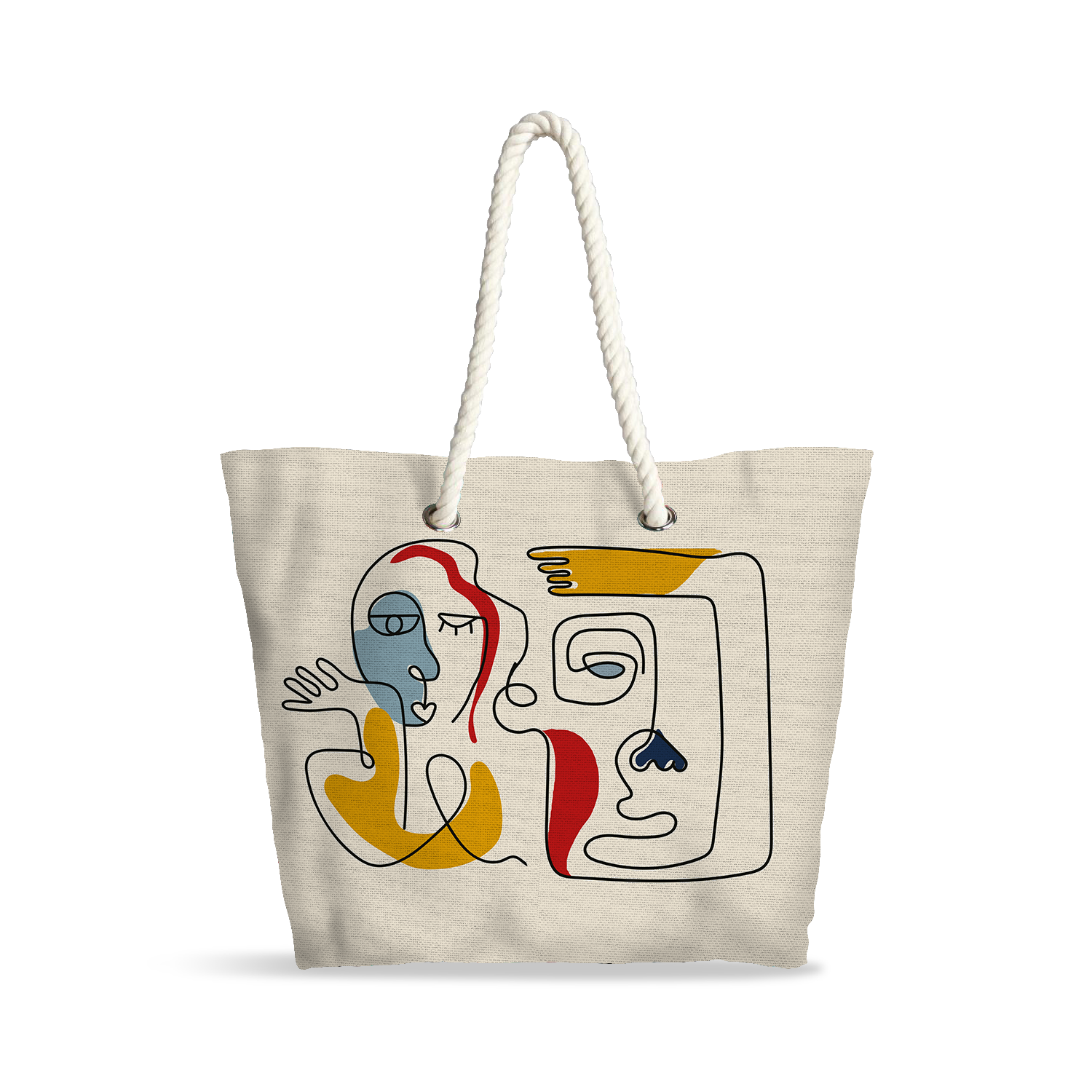 Le sac cabas “Visages Duo” met en lumière deux profils entrelacés d’un seul trait sur fond beige. Une œuvre minimaliste et poétique qui symbolise la connexion et l’harmonie.