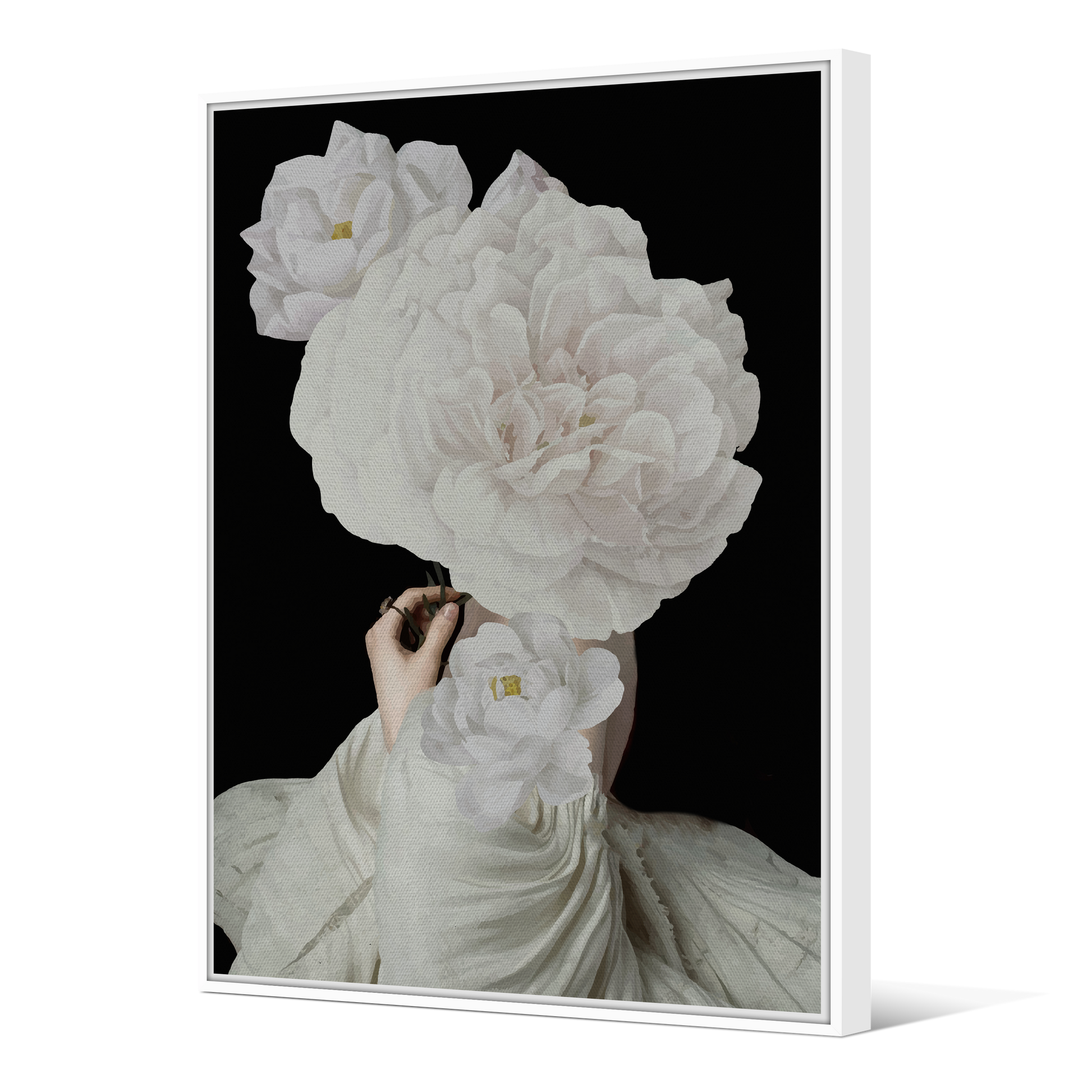 Le tableau “Pureté Énigmatique” séduit par son esthétique minimaliste et poétique. On y découvre une silhouette féminine dont la tête disparaît sous un bouquet majestueux de fleurs blanches : pivoines et roses aux pétales immaculés, délicatement rehaussées de touches dorées. Drapée de tissu blanc aux plis sculptés, la figure se détache avec grâce sur un fond noir profond, créant un contraste saisissant digne des plus grands clairs-obscurs.