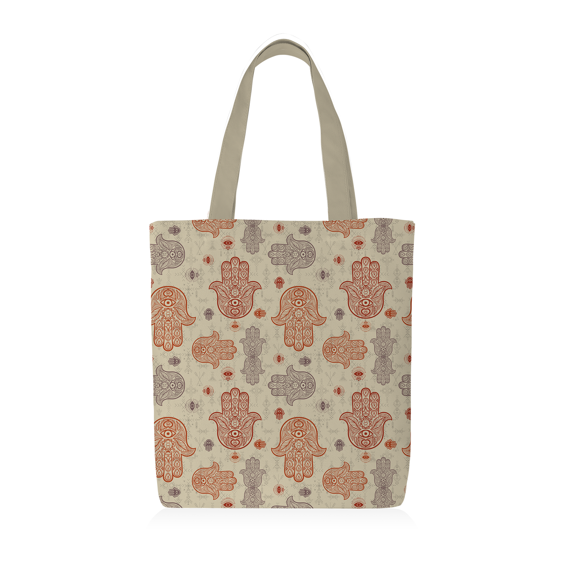 Le tote bag “Khmissa – Ombre Sacrée – Rouge & Lavande” transforme la symbolique protectrice de la main berbère en un accessoire moderne et élégant. Ses khmissas rouges et lavande, disposées en motifs délicats sur un fond beige raffiné, apportent à la fois protection, style et authenticité à votre quotidien.