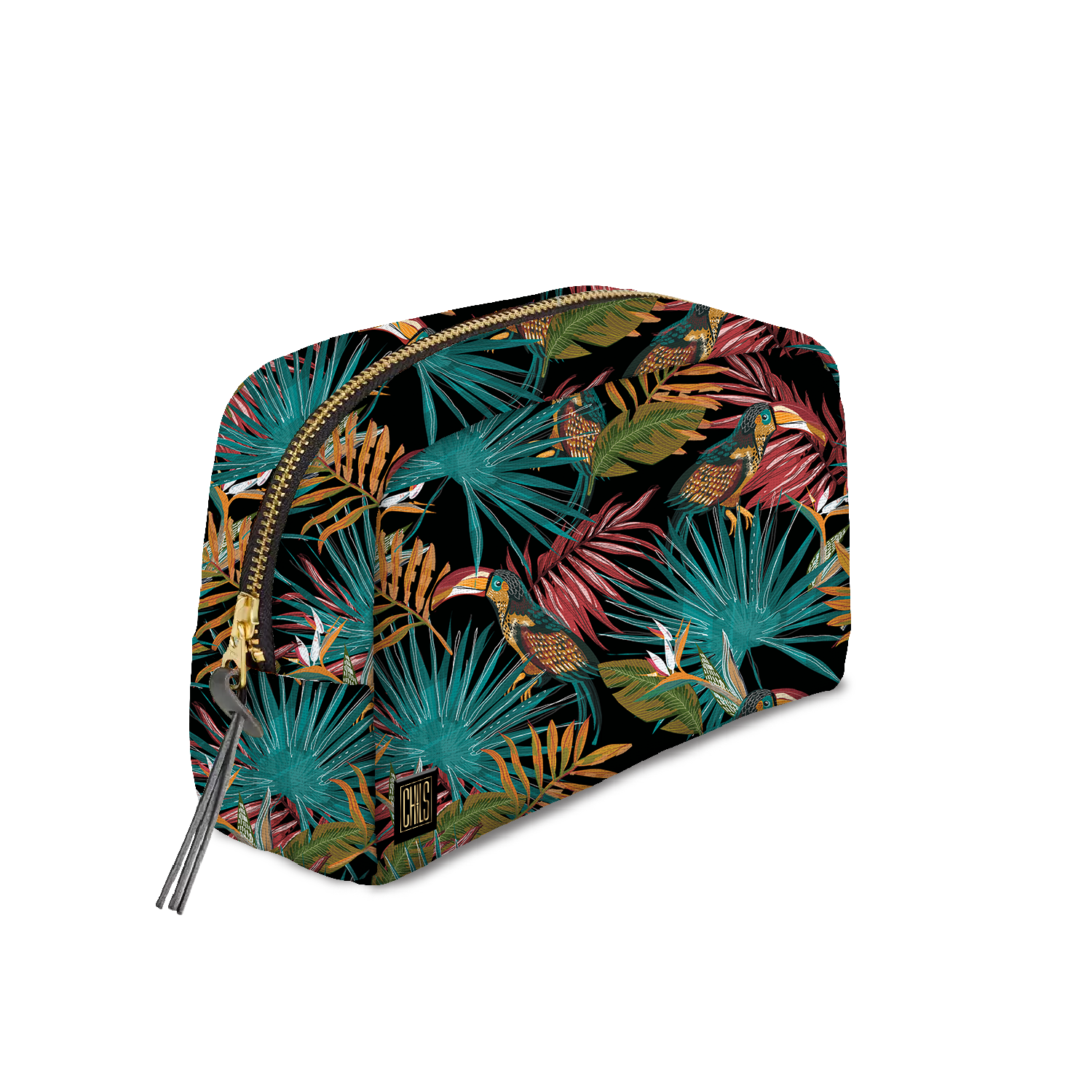 La trousse “Calaos Éclatant” met en scène des calaos tropicaux aux couleurs éclatantes sur un fond lumineux, un accessoire à la fois graphique et exotique.