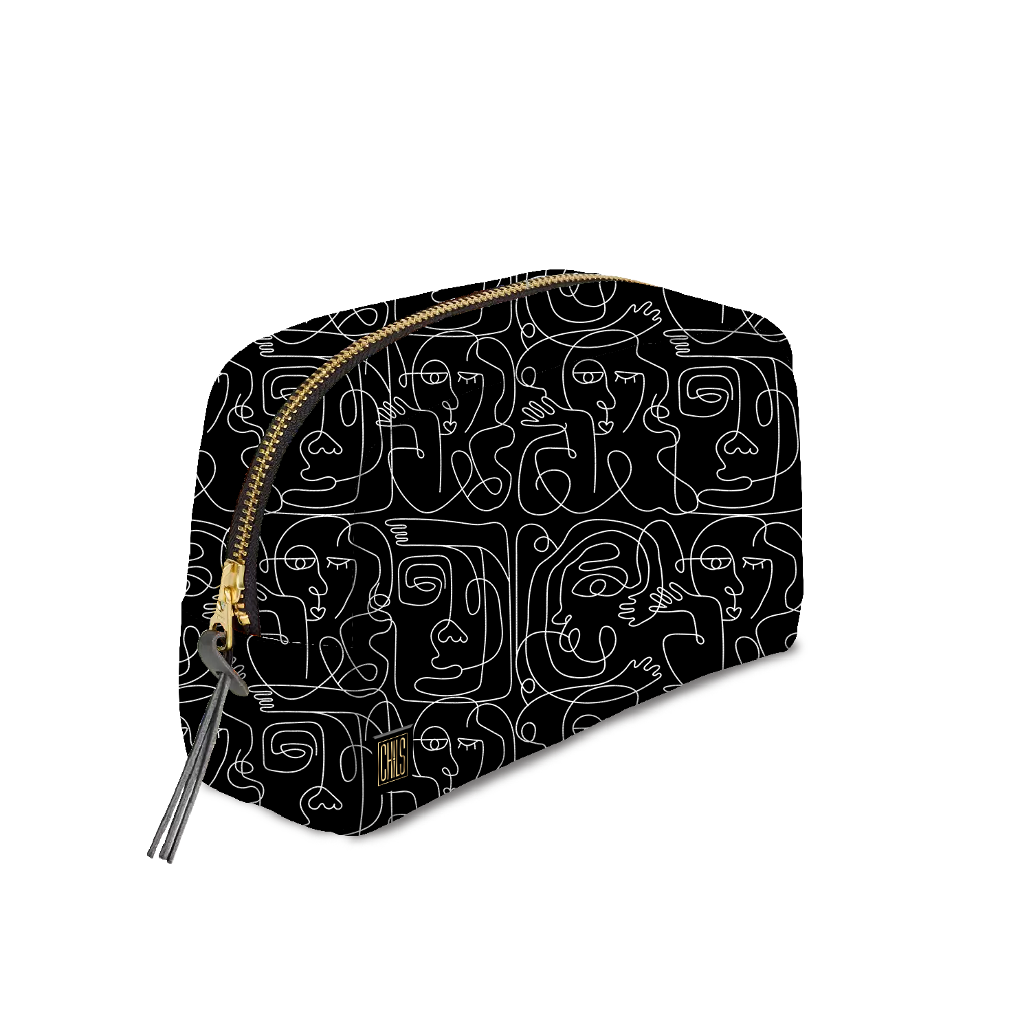 Trousse Classique | Collection One Line | Visages Carrés Abstraits – Blanc sur Fond Noir
