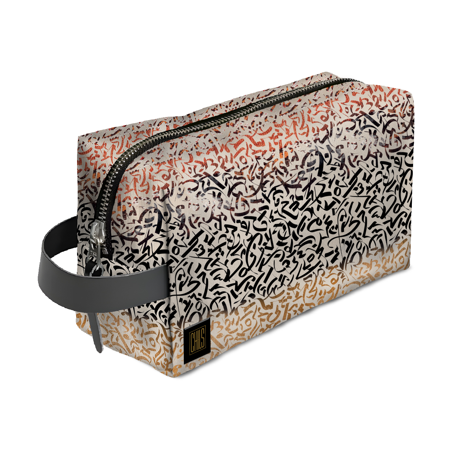 La trousse de voyage “Lettres d’Orient” allie élégance, fonctionnalité et héritage culturel. Son motif s’inspire de la calligraphie arabe, où des lettres stylisées se déploient sur toute la surface, créant un jeu graphique et raffiné qui évoque poésie et modernité.