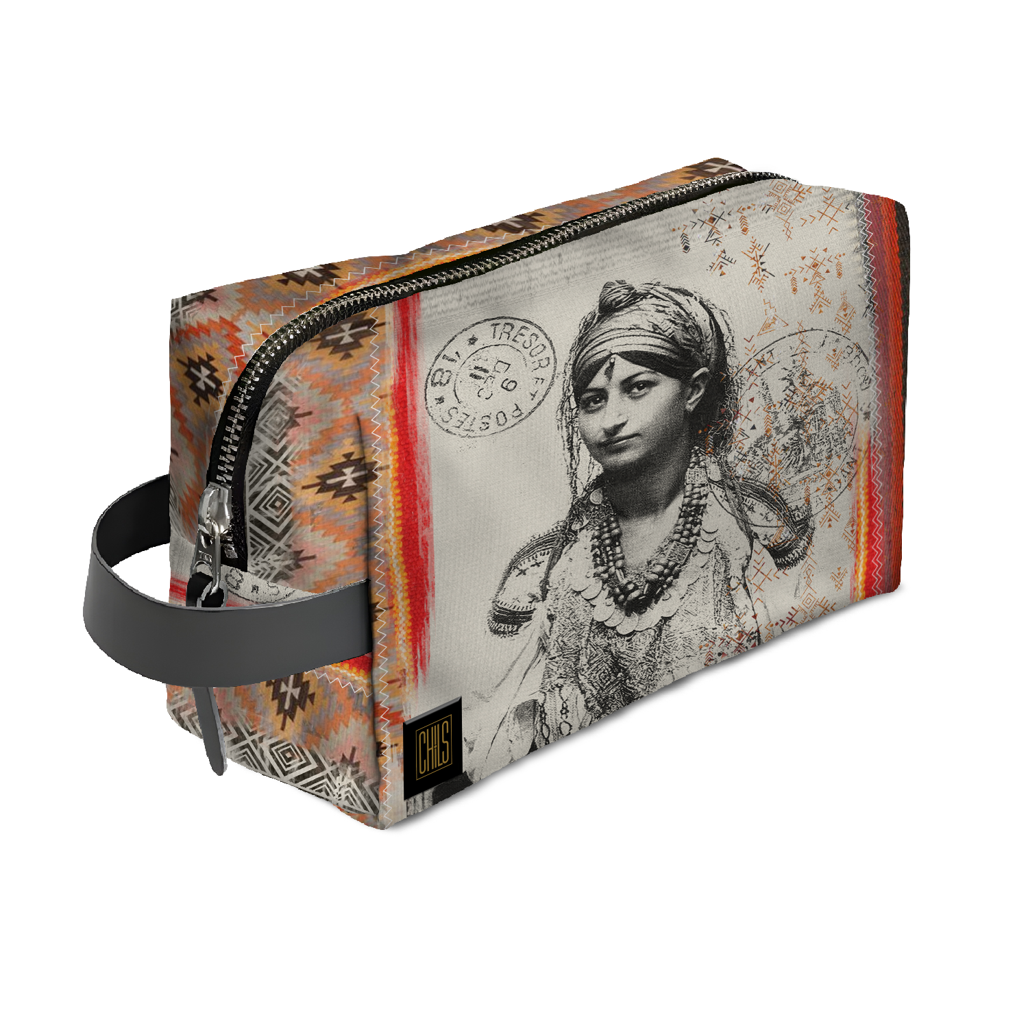Apportez une note artistique et culturelle à vos déplacements avec la trousse de voyage “Harmonie Tribale”. Inspirée des portraits de jeunes berbères sur de vieilles cartes postales, enrichie de motifs tribaux, tatouages et mosaïques colorées, cette trousse marie héritage et modernité dans une palette de tons ocre chaleureux, offrant à la fois style et praticité.