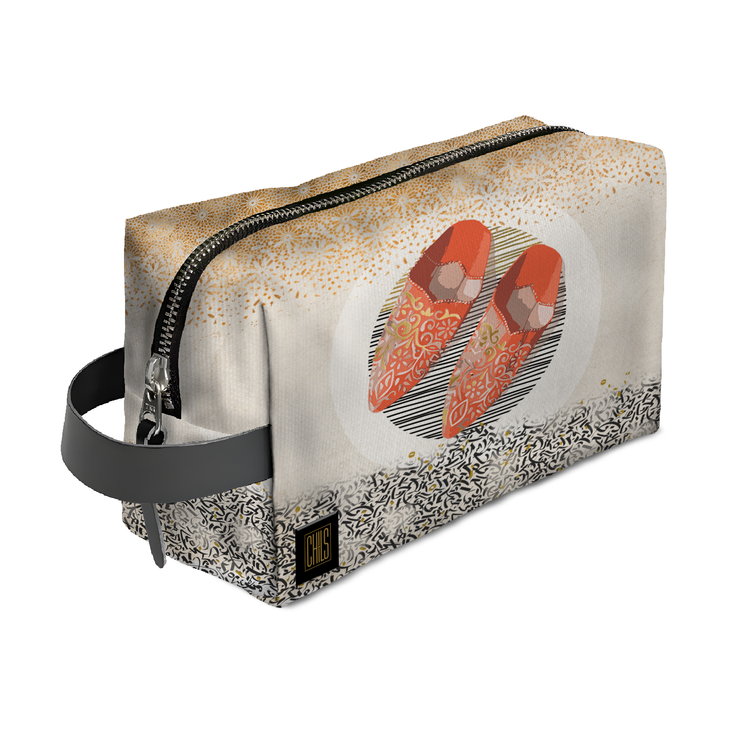 Protégez et organisez vos essentiels avec la trousse de voyage “Cherbil d’Or”, un accessoire qui allie élégance, praticité et héritage berbère. Son motif raffiné met en avant des cherbils dorés, symboles de lumière et de protection, sur un fond harmonieux, créant un design graphique, sophistiqué et lumineux.