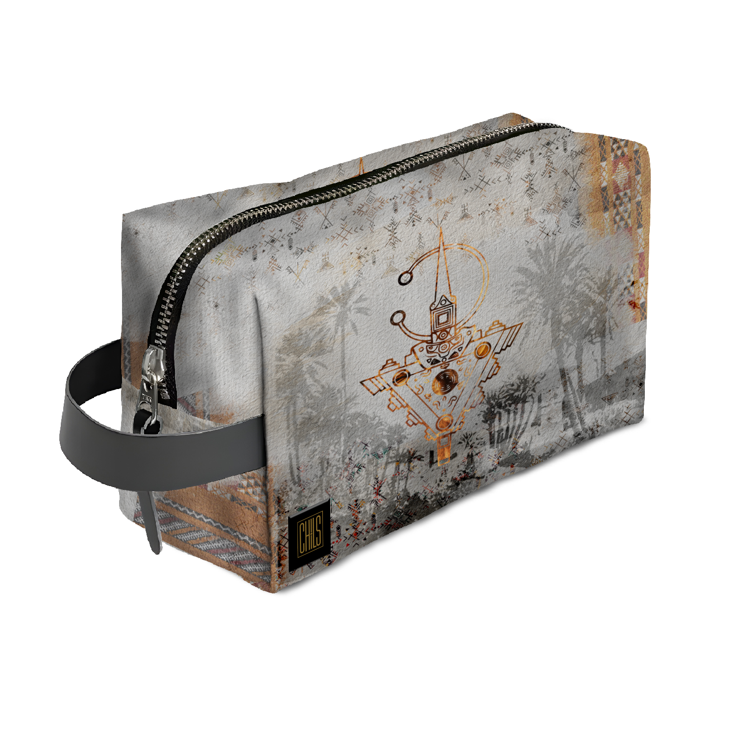 La trousse de voyage “Fibule” conjugue élégance patrimoniale et praticité moderne. Son motif met en lumière une fibule berbère stylisée, symbole de protection et de raffinement, rehaussée de tons ocre, orange cuivré et noir. En arrière-plan, des palmiers délavés apportent une touche de profondeur et d’évasion, évoquant subtilement les paysages du Sud marocain.