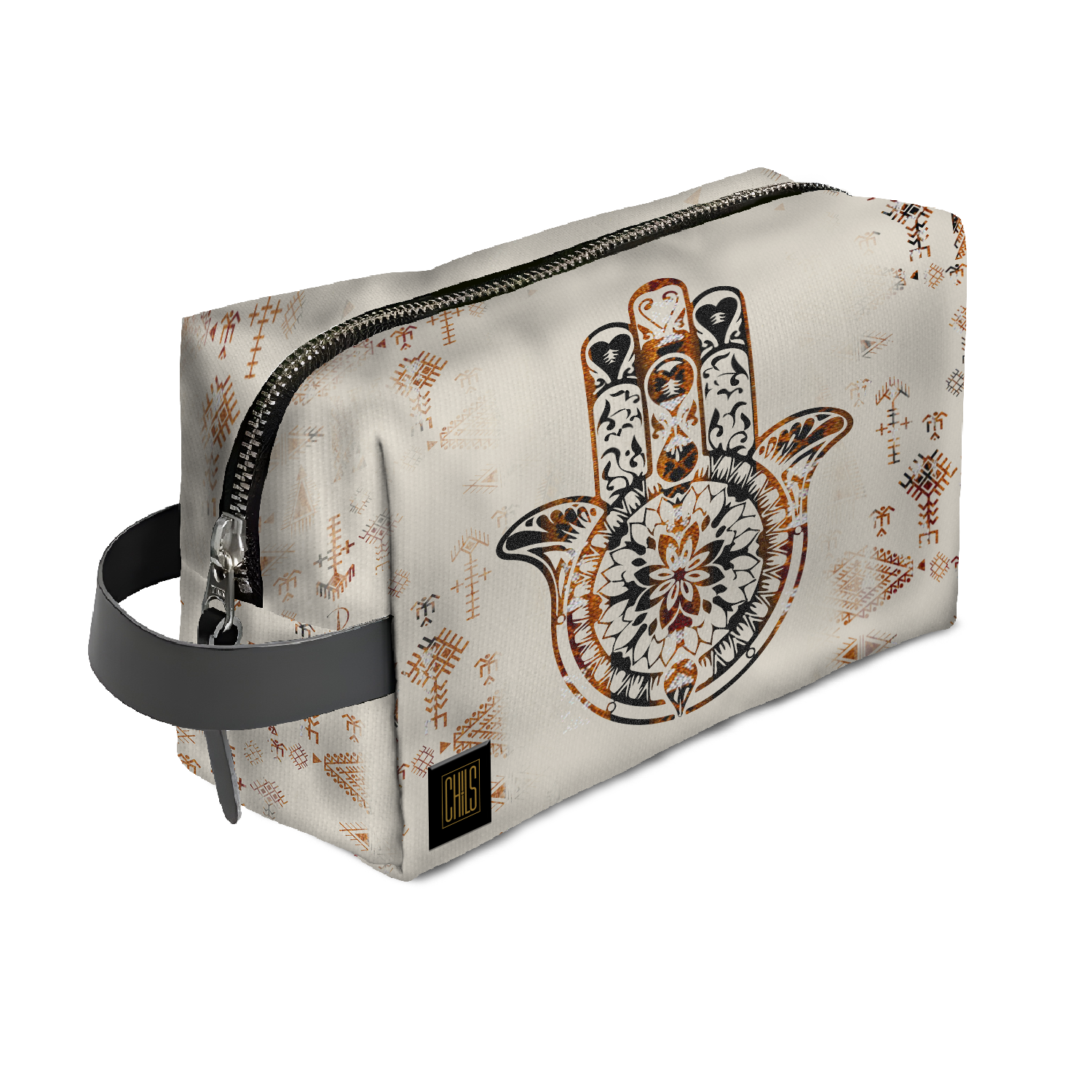 Alliez protection, style et praticité avec la trousse de voyage “Khmisa Tribale”, un accessoire inspiré du patrimoine berbère et revisité dans un design moderne. Son motif met en avant une khmisa centrale, symbole de chance et de protection, entourée d’une trame tribale raffinée, créant un équilibre parfait entre authenticité et modernité.