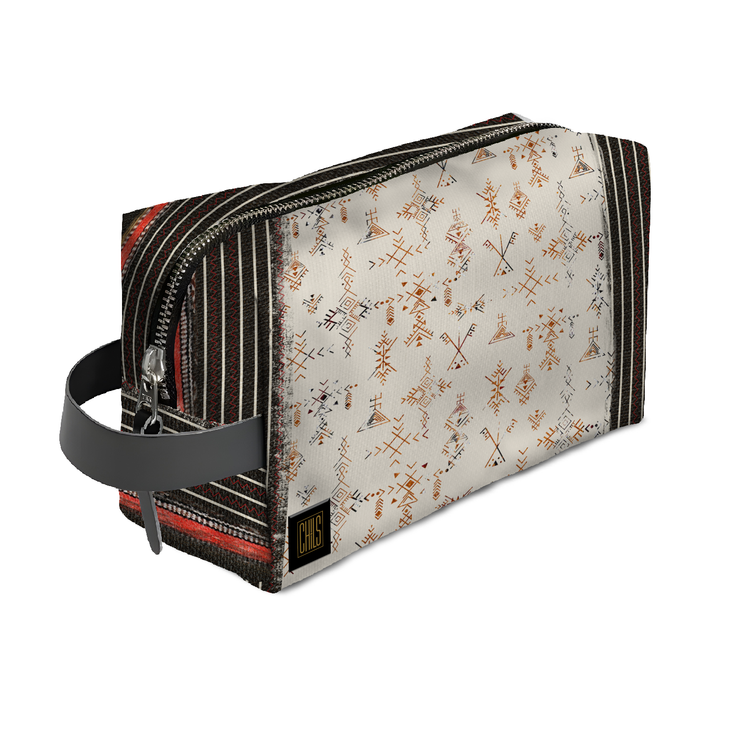 La trousse de voyage “Tatouages Ancestraux – Lignes Verticales” est bien plus qu’un accessoire : c’est une pièce de caractère, porteuse de mémoire et d’élégance contemporaine.